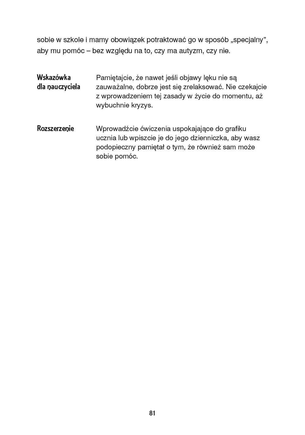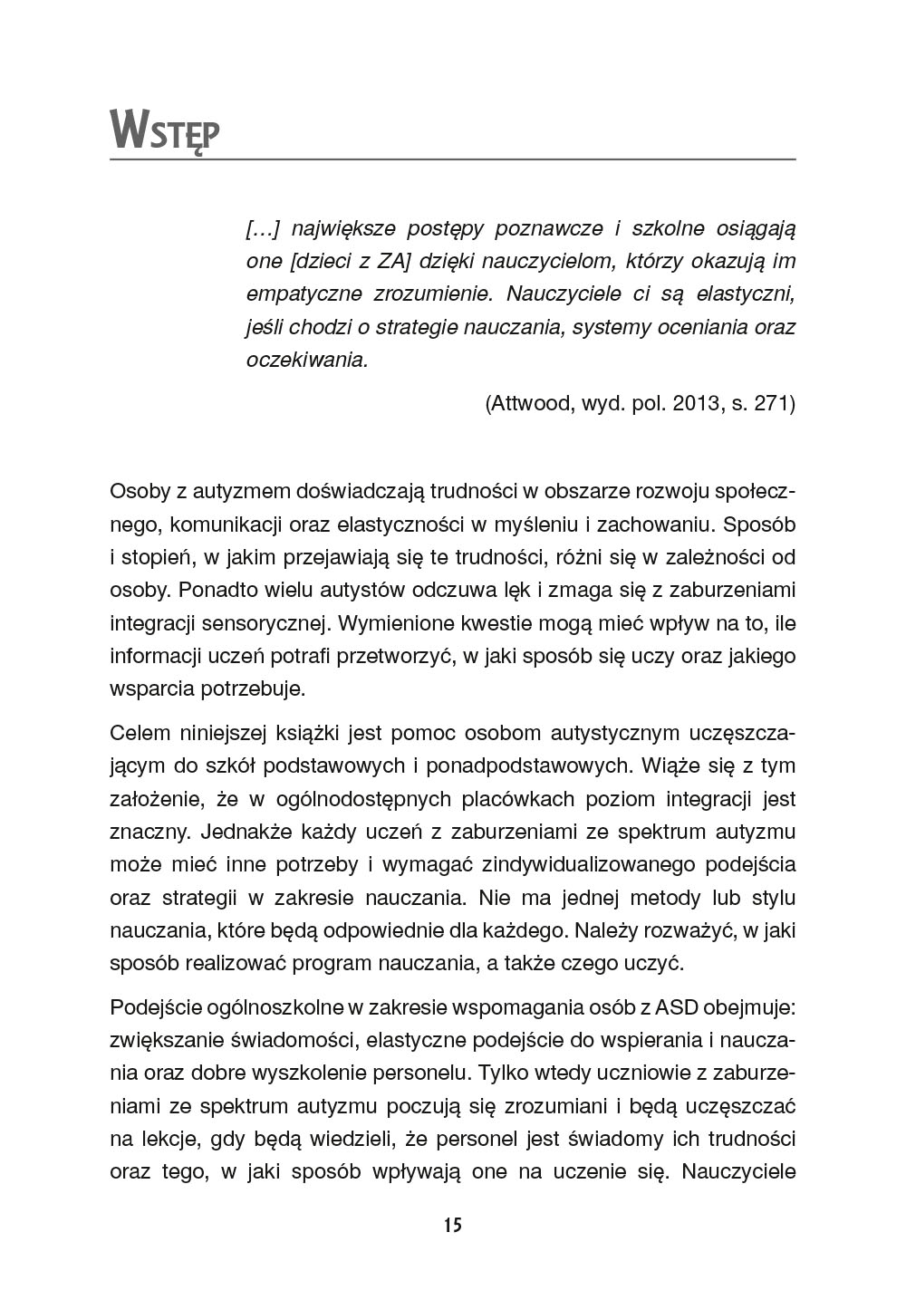 Niniejsza książka ma na celu pomóc nauczycielom we wdrażaniu strategii, opartych na podejściu inkluzyjnym, które stworzą środowisko nauki zapewniające uczniom z autyzmem odpowiednie wsparcie. Opisano tu kluczowe obszary, w jakich mogą się pojawić bariery w nauczaniu, i ponad 100 pomysłów (w tym dodatkowych pomysłów, wskazówek i propozycji modyfikacji) na ich pokonanie – w sposób rzeczowy, klarowny i łatwy do zrealizowania. Pomysły te mają ściśle aplikacyjny charakter, ponieważ autorka, jako doświadczony praktyk, odnosi się do realiów kształcenia uczniów ze specjalnymi potrzebami edukacyjnymi, podając przy tym odwołania do literatury przedmiotu oraz studiów przypadków. To poradnik dla każdego nauczyciela poszukującego w swojej pracy inspirujących i skutecznych rozwiązań