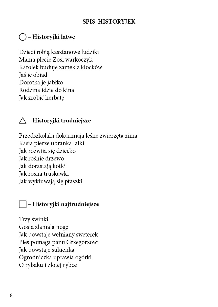 Są to materiały edukacyjne dla dzieci najmłodszych. Każda historyjka składa się z 4 obrazków, które dziecko ma ułożyć w odpowiedniej kolejności i włożyć do plastykowych kieszonek.