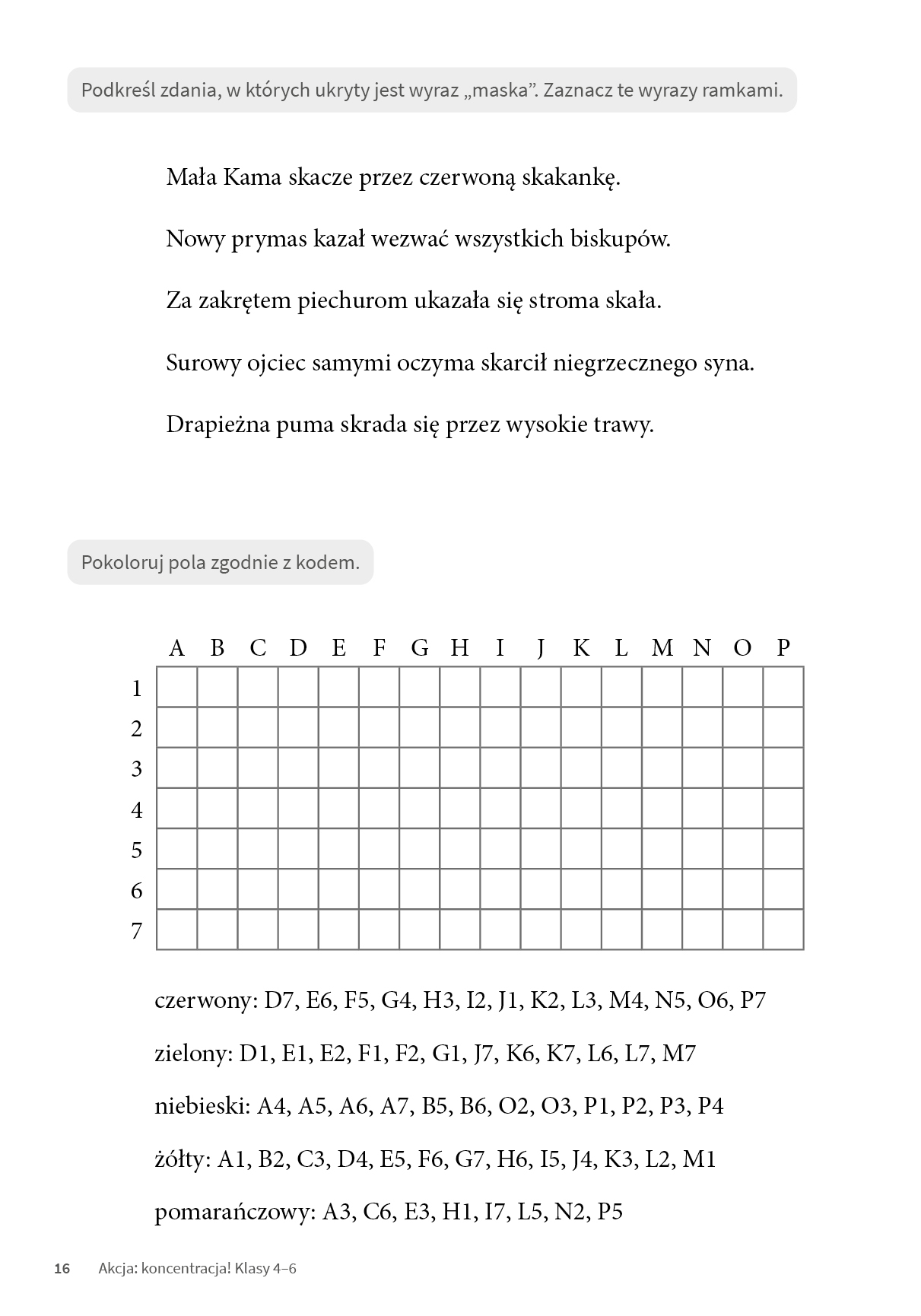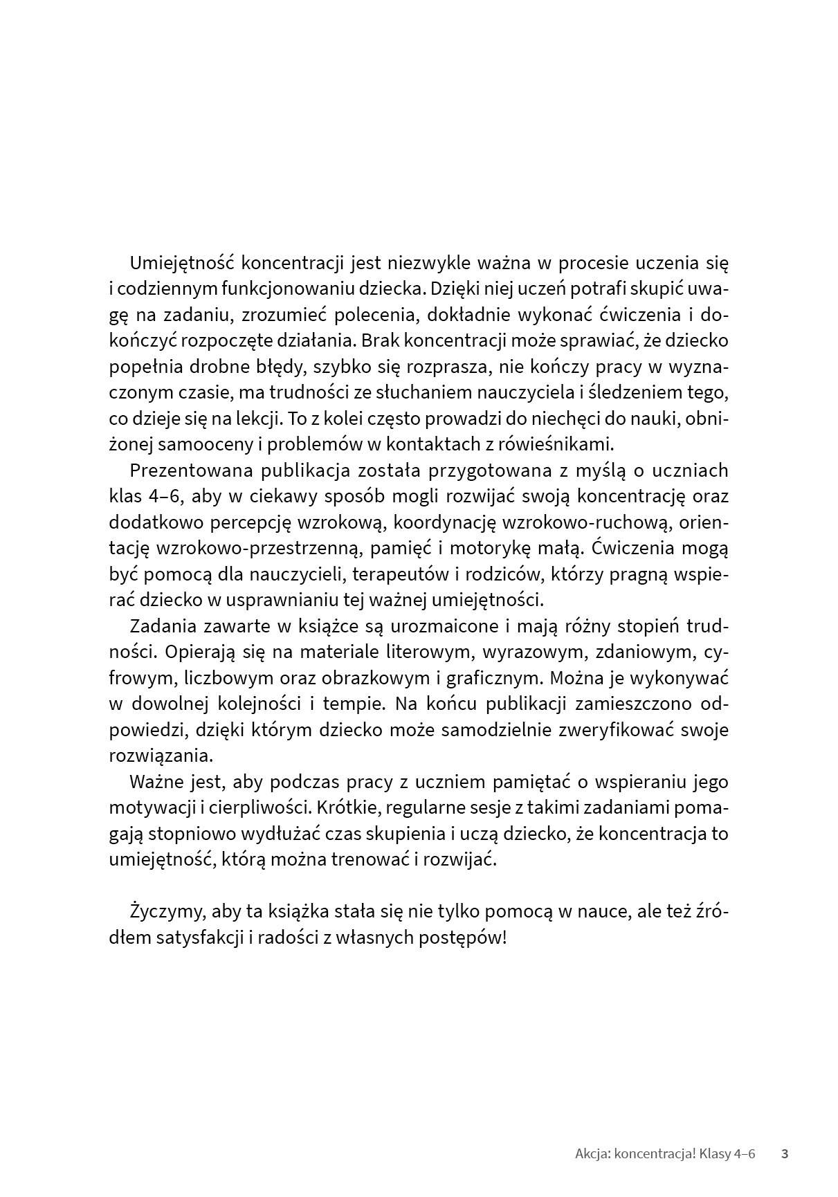 Koncentracja to jedna z kluczowych umiejętności, która pomaga dziecku efektywnie się uczyć i sprawnie funkcjonować na co dzień. Umożliwia skupienie uwagi na zadaniu, dokładne wykonywanie poleceń oraz doprowadzanie rozpoczętej pracy do końca – dlatego warto ją rozwijać już od najmłodszych lat. Seria Akcja: koncentracja! została stworzona z myślą o uczniach szkoły podstawowej, którzy potrzebują wsparcia w doskonaleniu tej ważnej kompetencji. Publikacje oferują ciekawe, różnorodne i angażujące ćwiczenia oparte na materiale literowym, wyrazowym, zdaniowym, cyfrowym, liczbowym, obrazkowym i graficznym.