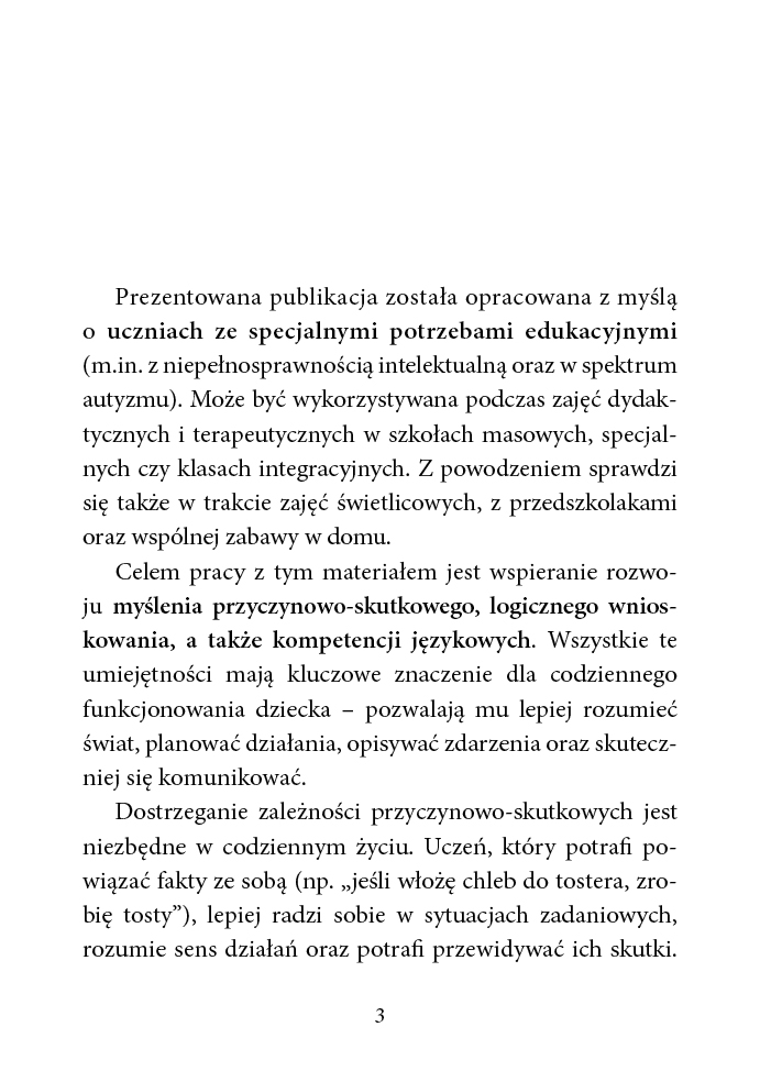 Celem pracy z publikacją jest wspieranie rozwoju myślenia przyczynowo-skutkowego, logicznego wnioskowania, a także kompetencji językowych, czyli umiejętności, dzięki którym dziecko lepiej rozumie świat, planuje działania, opisuje zdarzenia oraz skuteczniej się komunikuje.