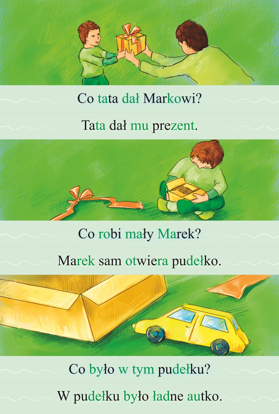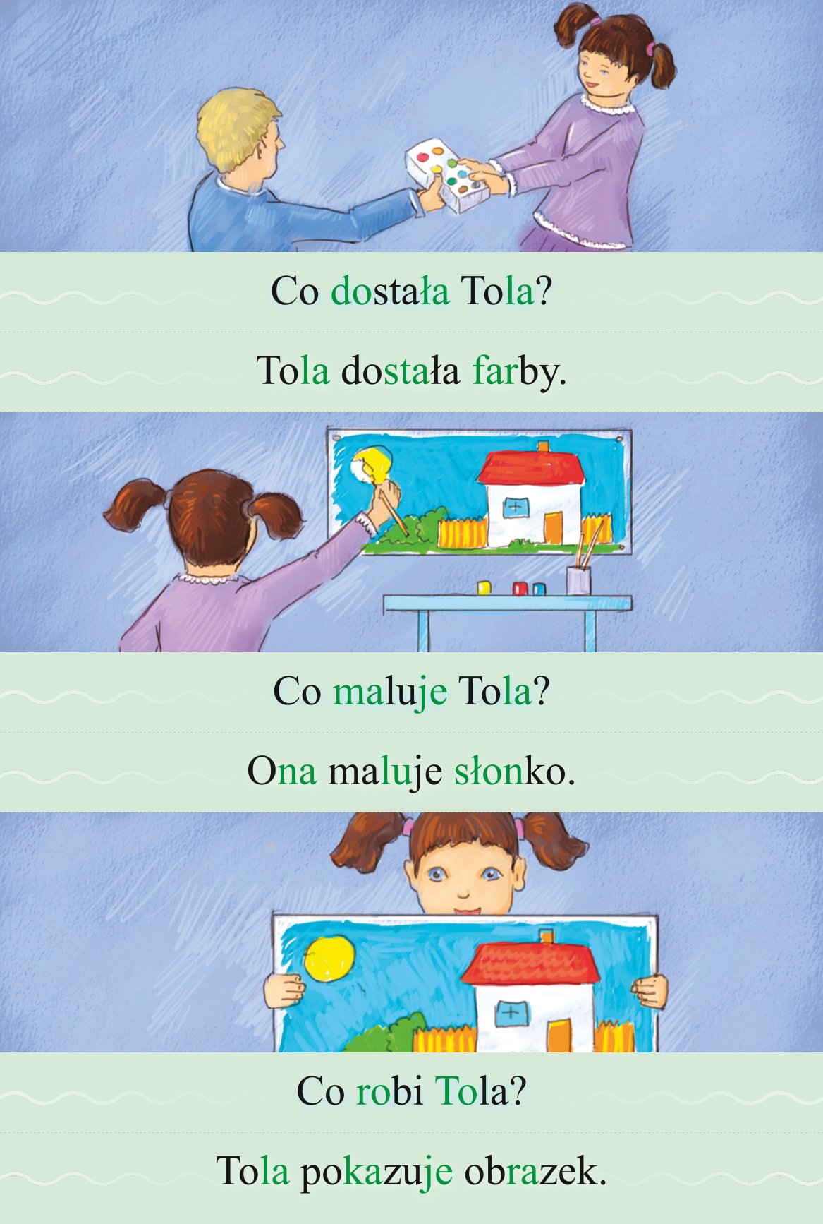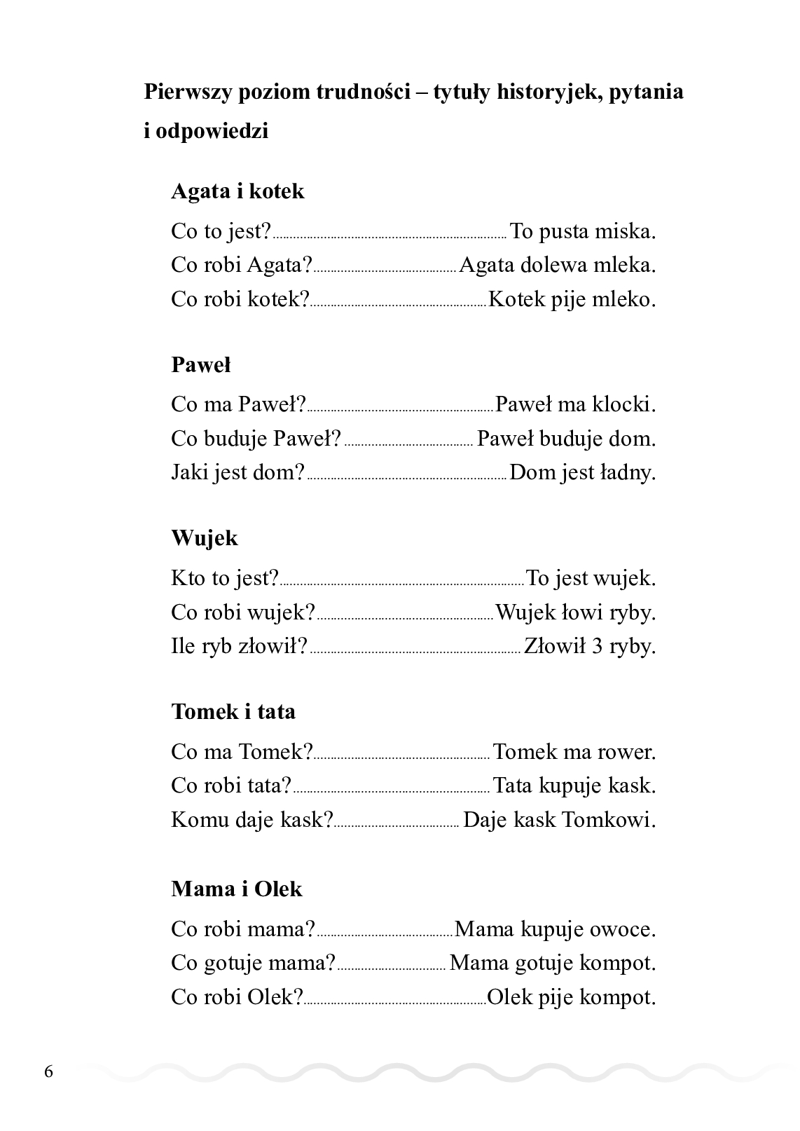 Dziecko – pracując z pomocą dorosłego lub pod jego kontrolą – powinno przyjrzeć się uważnie wszystkim trzem obrazkom należącym do jednej historyjki, a następnie ułożyć je w odpowiedniej kolejności. Następnie powinno przeczytać pytania i dobrać do nich odpowiedzi. Ułożone historyjki nauczyciel może wykorzystać do ćwiczeń w czytaniu, rozwijaniu mowy czynnej, a zwłaszcza umiejętności mówienia zdaniami, opowiadania.