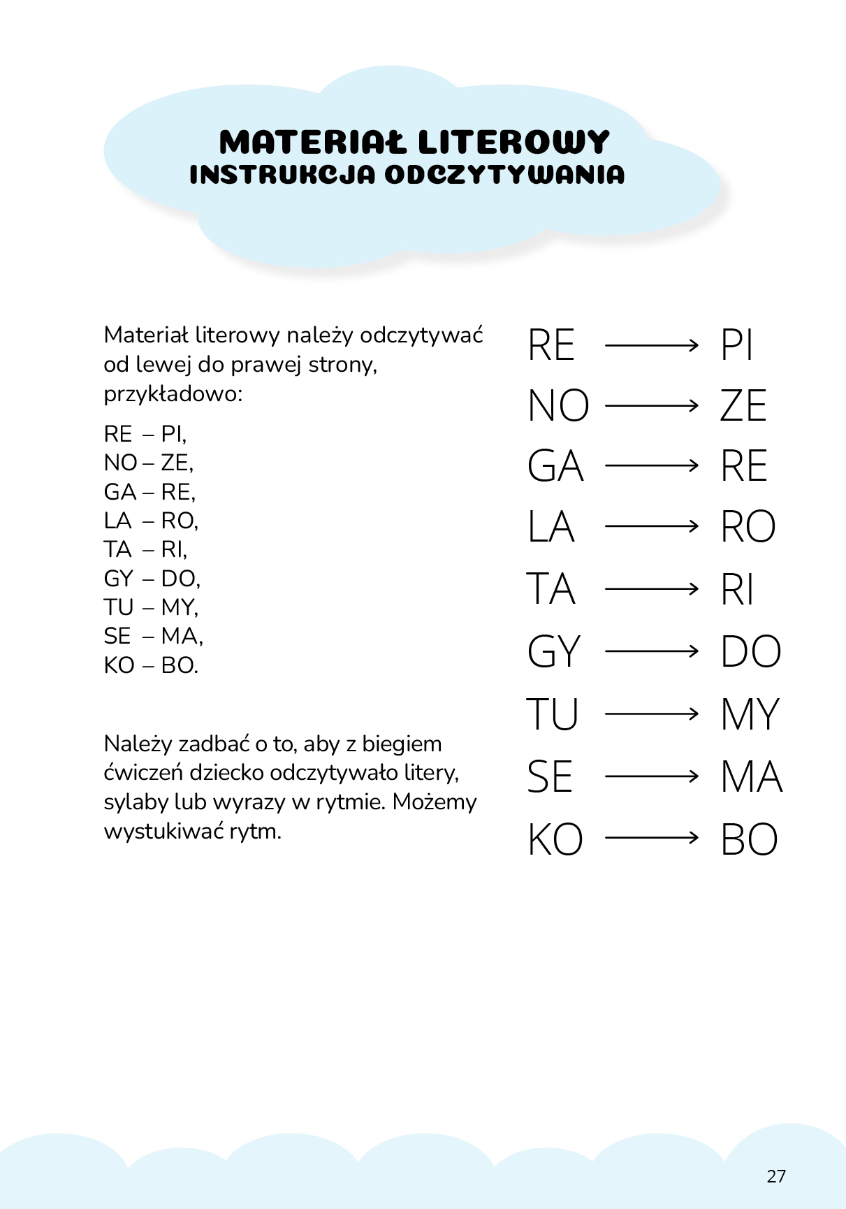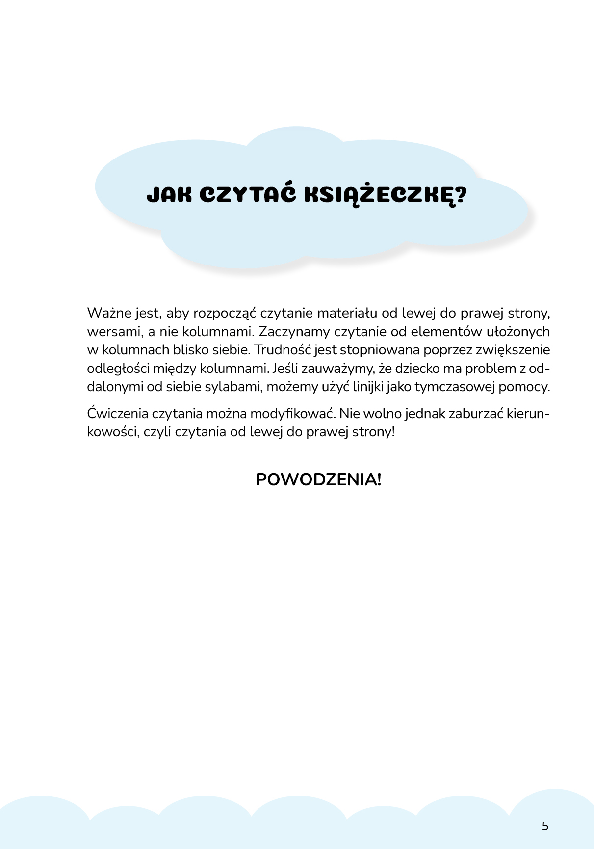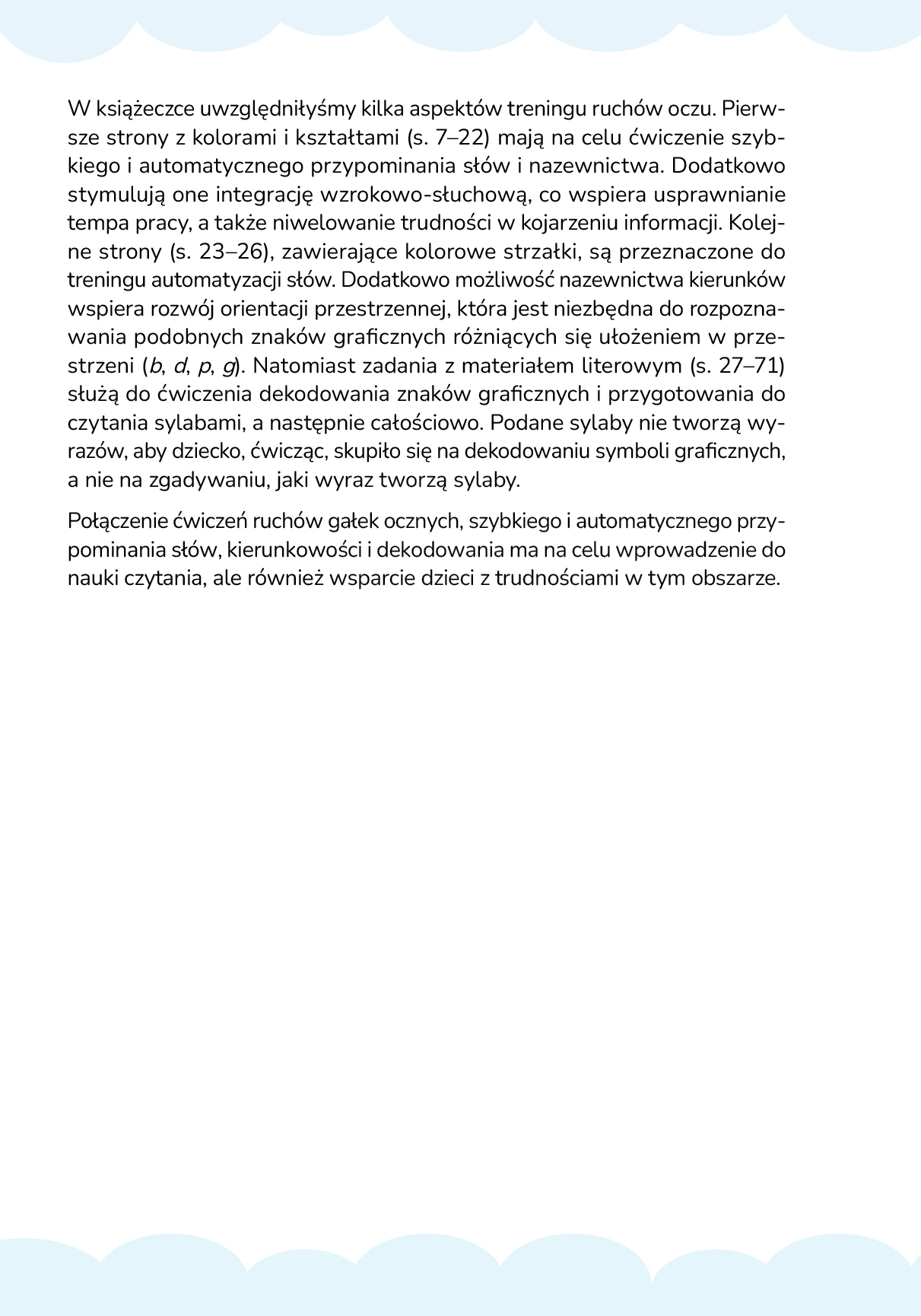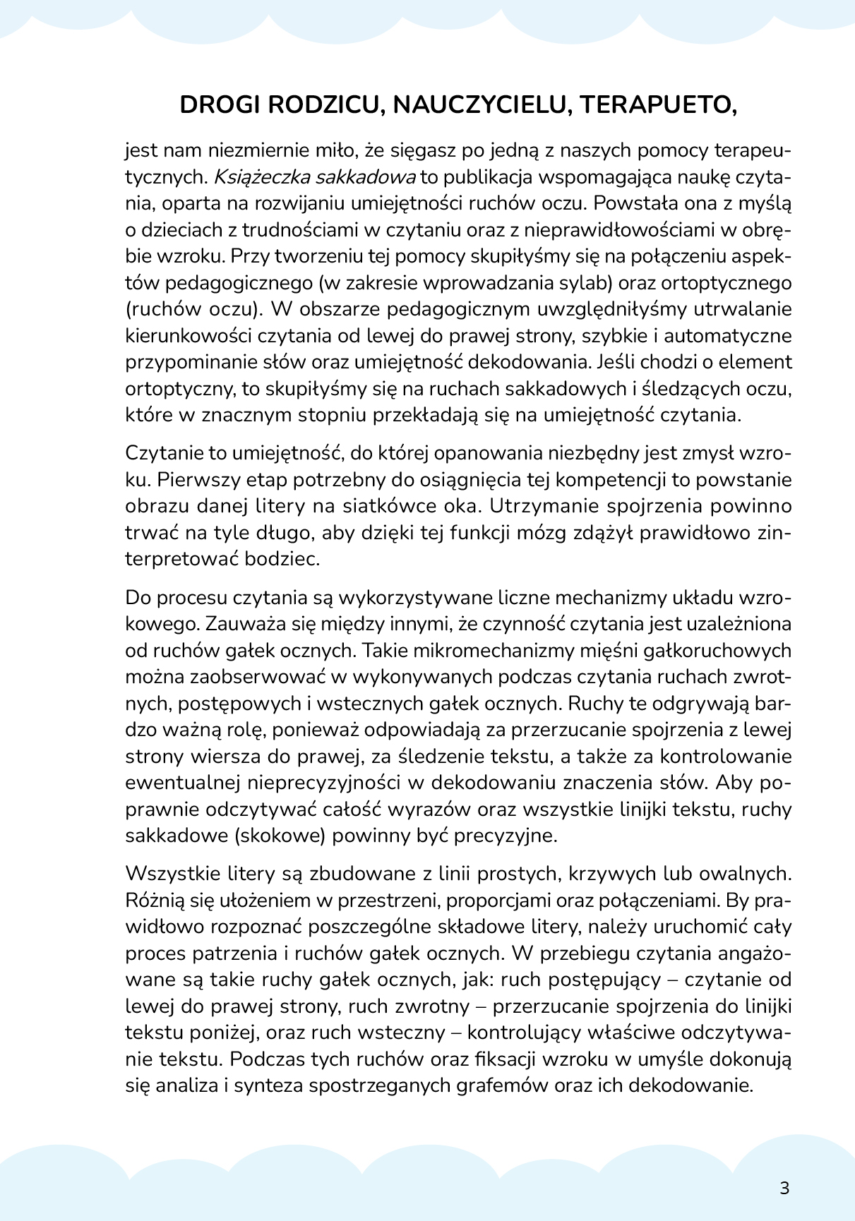 Książeczka sakkadowa to publikacja wspomagająca naukę czytania, oparta na rozwijaniu umiejętności ruchów oczu. Powstała ona z myślą o dzieciach z trudnościami w czytaniu oraz z nieprawidłowościami w obrębie wzroku. Materiał łączy aspekt pedagogiczny (w zakresie wprowadzania sylab) z ortoptycznym (ruchów oczu). W obszarze pedagogicznym uwzględniono utrwalanie kierunkowości czytania od lewej do prawej strony, szybkie i automatyczne przypominanie słów oraz umiejętność dekodowania. Elementem ortoptycznym są ruchy sakkadowe i śledzące oczu, które w znacznym stopniu przekładają się na umiejętność czytania. Połączenie ćwiczeń ruchów gałek ocznych, szybkiego i automatycznego przypominania słów, kierunkowości i dekodowania ma na celu wprowadzenie do nauki czytania, ale również wsparcie dzieci z trudnościami w tym obszarze.
