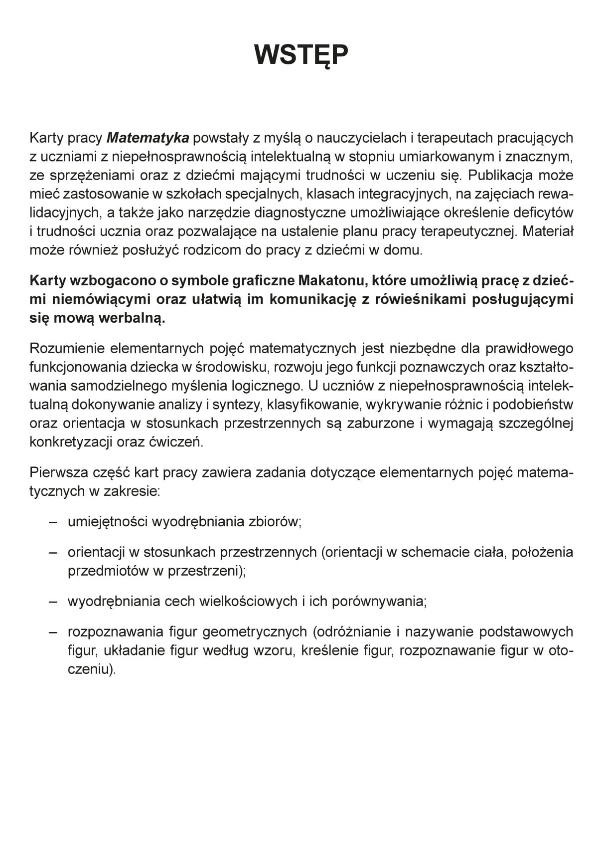 Niniejsza publikacja powstała z myślą o nauczycielach i terapeutach pracujących z uczniami z niepełnosprawnością intelektualną w stopniu umiarkowanym i znacznym, ze sprzężeniami oraz z dziećmi mającymi trudności w uczeniu się. Publikacja może mieć zastosowanie w szkołach specjalnych, klasach integracyjnych, na zajęciach rewalidacyjnych oraz jako narzędzie diagnostyczne umożliwiające określenie deficytów i trudności ucznia oraz pozwalające na ustalenie planu terapii. Karty pracy mogą również posłużyć rodzicom do pracy z dziećmi w domu. Rozumienie elementarnych pojęć matematycznych jest niezbędne dla prawidłowego funkcjonowania dziecka w środowisku, rozwoju jego funkcji poznawczych oraz kształtowania samodzielnego myślenia logicznego. U uczniów z niepełnosprawnością intelektualną dokonywanie analizy i syntezy, klasyfikowanie, wykrywanie różnic i podobieństw oraz orientacja w stosunkach przestrzennych są zaburzone i wymagają szczególnej konkretyzacji oraz ćwiczeń. Karty pracy (część 1) zawierają zadania dotyczące elementarnych pojęć matematycznych w zakresie: