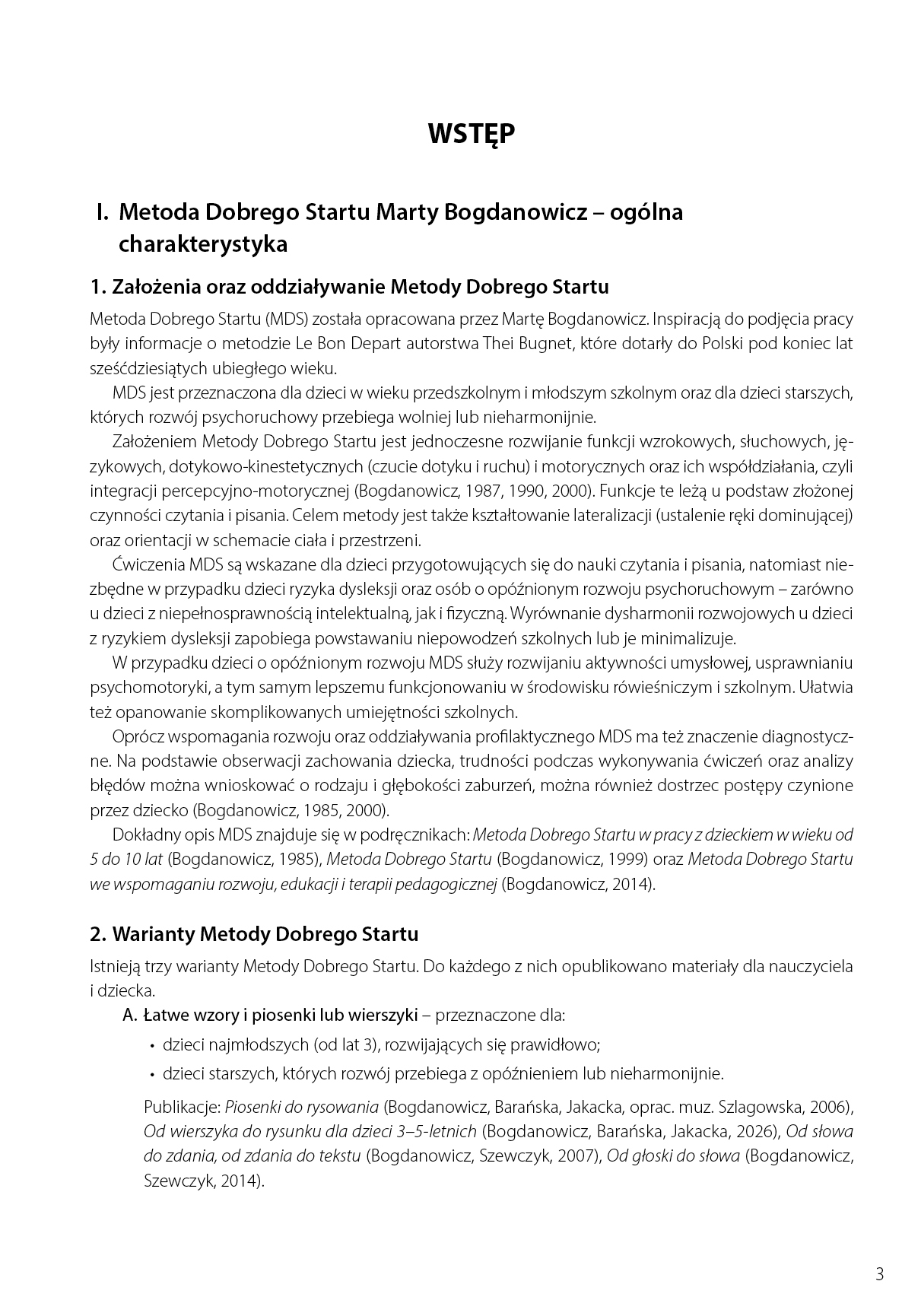Metoda Dobrego Startu jest przeznaczona dla dzieci w wieku przedszkolnym i młodszym szkolnym, a także dla tych, których rozwój psychoruchowy przebiega wolniej lub nieharmonijnie. Programy MDS są szczególnie wskazane w okresie przygotowania do nauki czytania i pisania, a niezbędne w przypadku ryzyka dysleksji oraz opóźnionego rozwoju psychoruchowego. Zawarte w nich ćwiczenia stanowią profilaktykę niepowodzeń szkolnych poprzez wspieranie rozwoju funkcji wzrokowo-przestrzennych, słuchowo-językowych i ruchowych oraz ich współdziałania. Pomagają kształtować lateralizację, orientację w schemacie ciała i przestrzeni, rozwijają aktywność umysłową, usprawniają psychomotorykę oraz ułatwiają funkcjonowanie dziecka w środowisku rówieśniczym. Materiał może być wykorzystywany zarówno w przedszkolu, szkole specjalnej, jak i w ośrodkach terapeutycznych, indywidualnie lub w grupie.