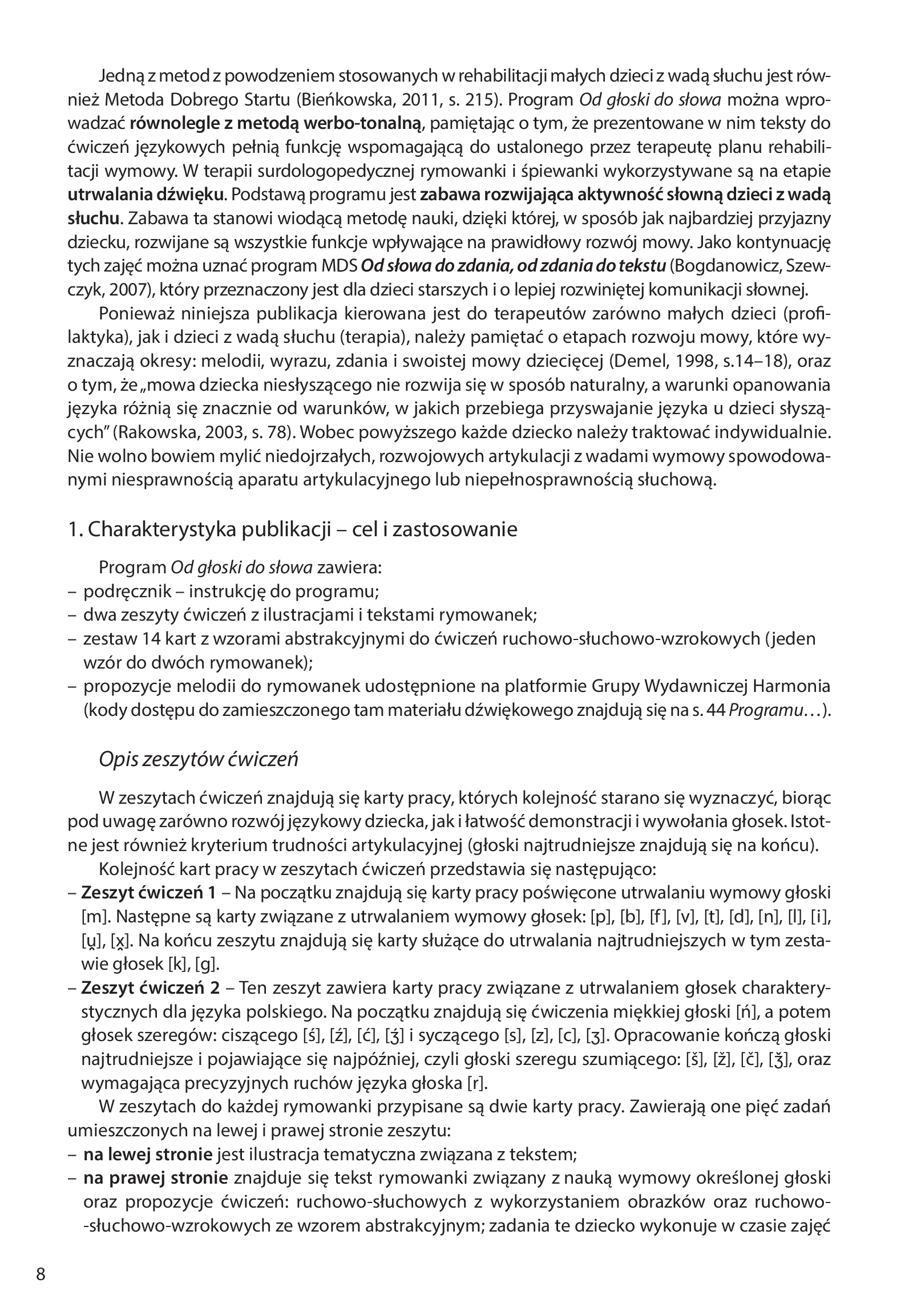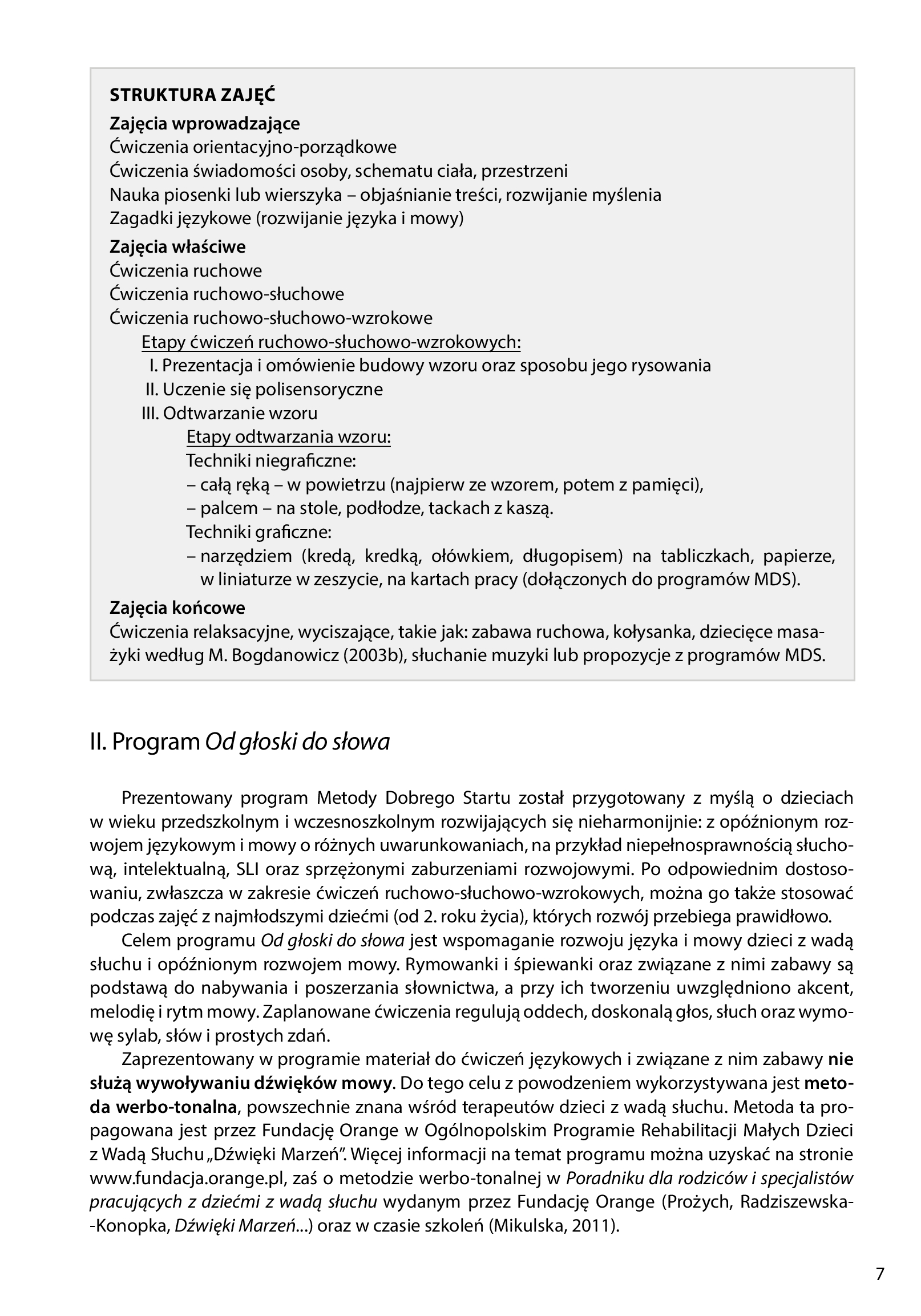 Celem programu Od głoski do słowa jest wspomaganie rozwoju języka i mowy dzieci z wadą słuchu i opóźnionym rozwojem mowy. Rymowanki i śpiewanki oraz związane z nimi zabawy są podstawą do nabywania i poszerzania słownictwa, a przy ich tworzeniu uwzględniono akcent, melodię i rytm mowy. Zaplanowane ćwiczenia regulują oddech, doskonalą głos, słuch oraz wymowę sylab, słów i prostych zdań.