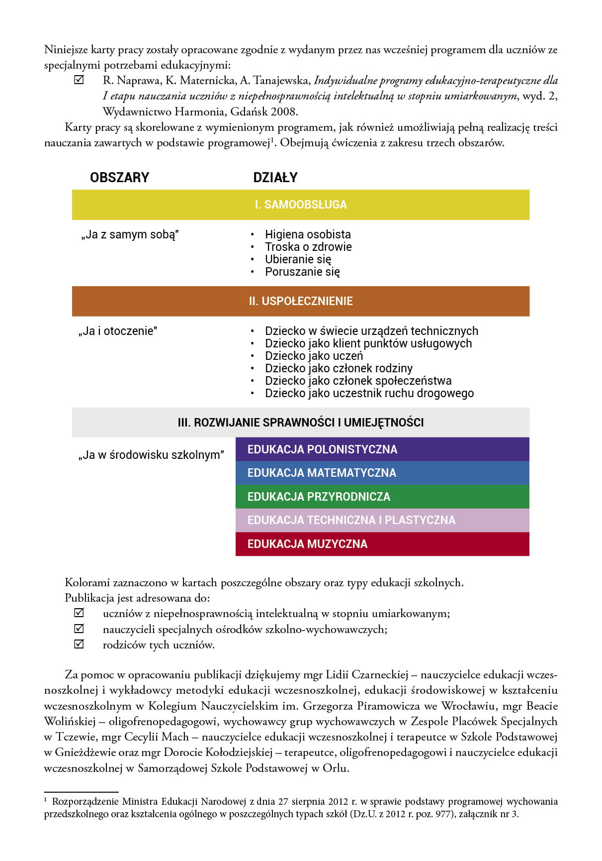 Publikacja zawiera materiał z trzech obszarów: samoobsługi, uspołecznienia, rozwijania sprawności i umiejętności. Tematyka kart pracy odpowiada rozkładowi materiału nauczania dla uczniów z niepełnosprawnością intelektualną i umożliwia pełną realizację treści zawartych w podstawie programowej.