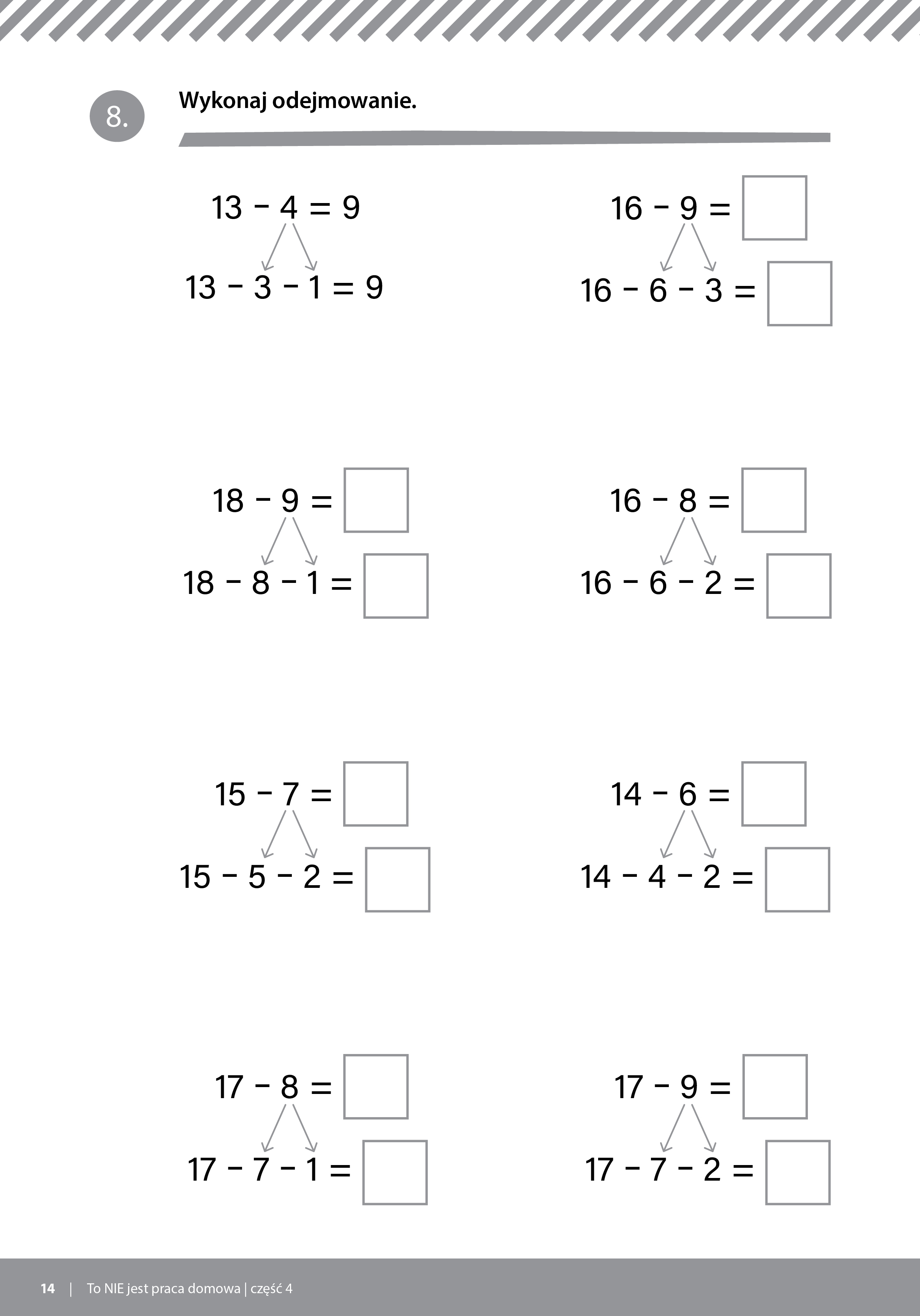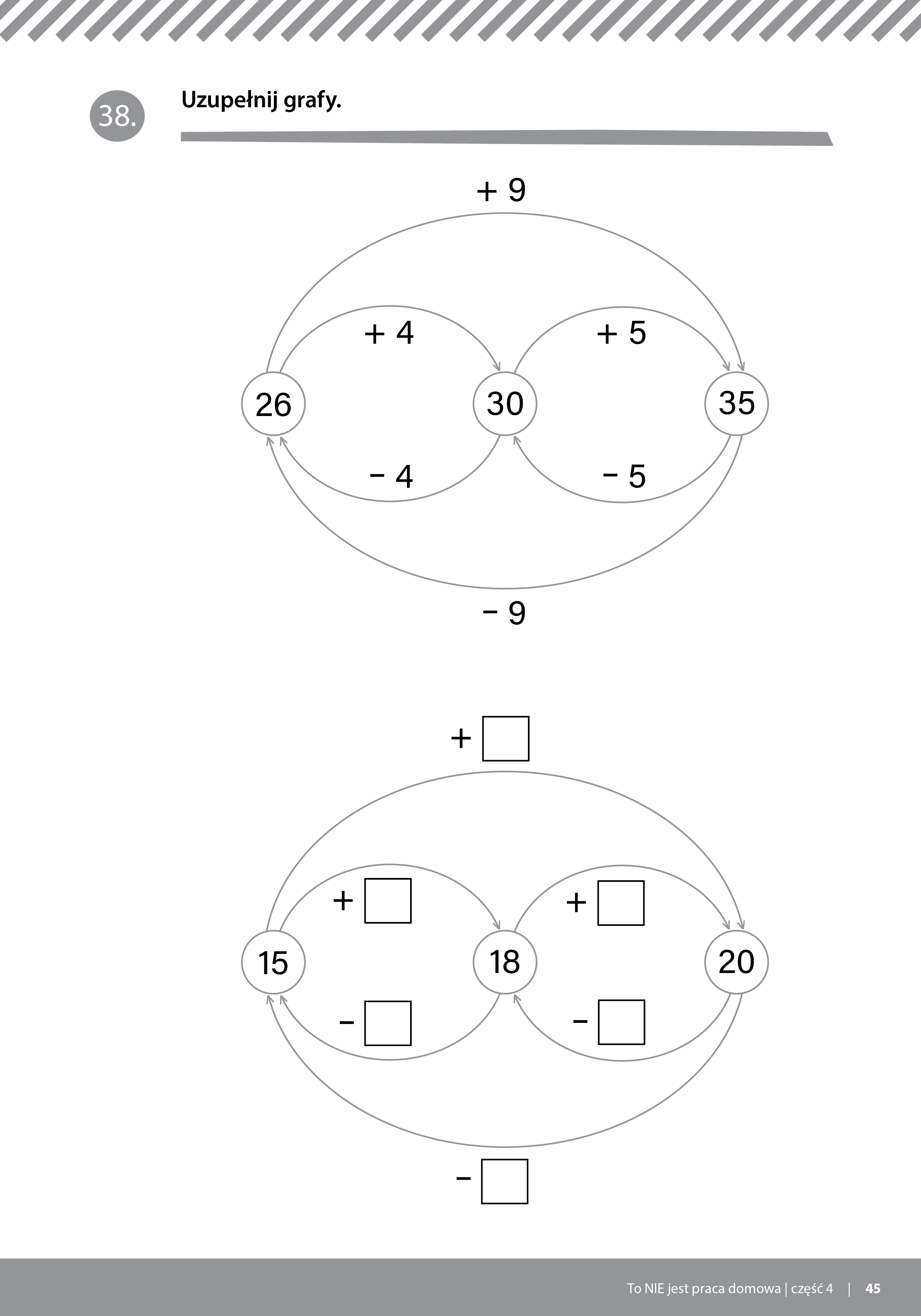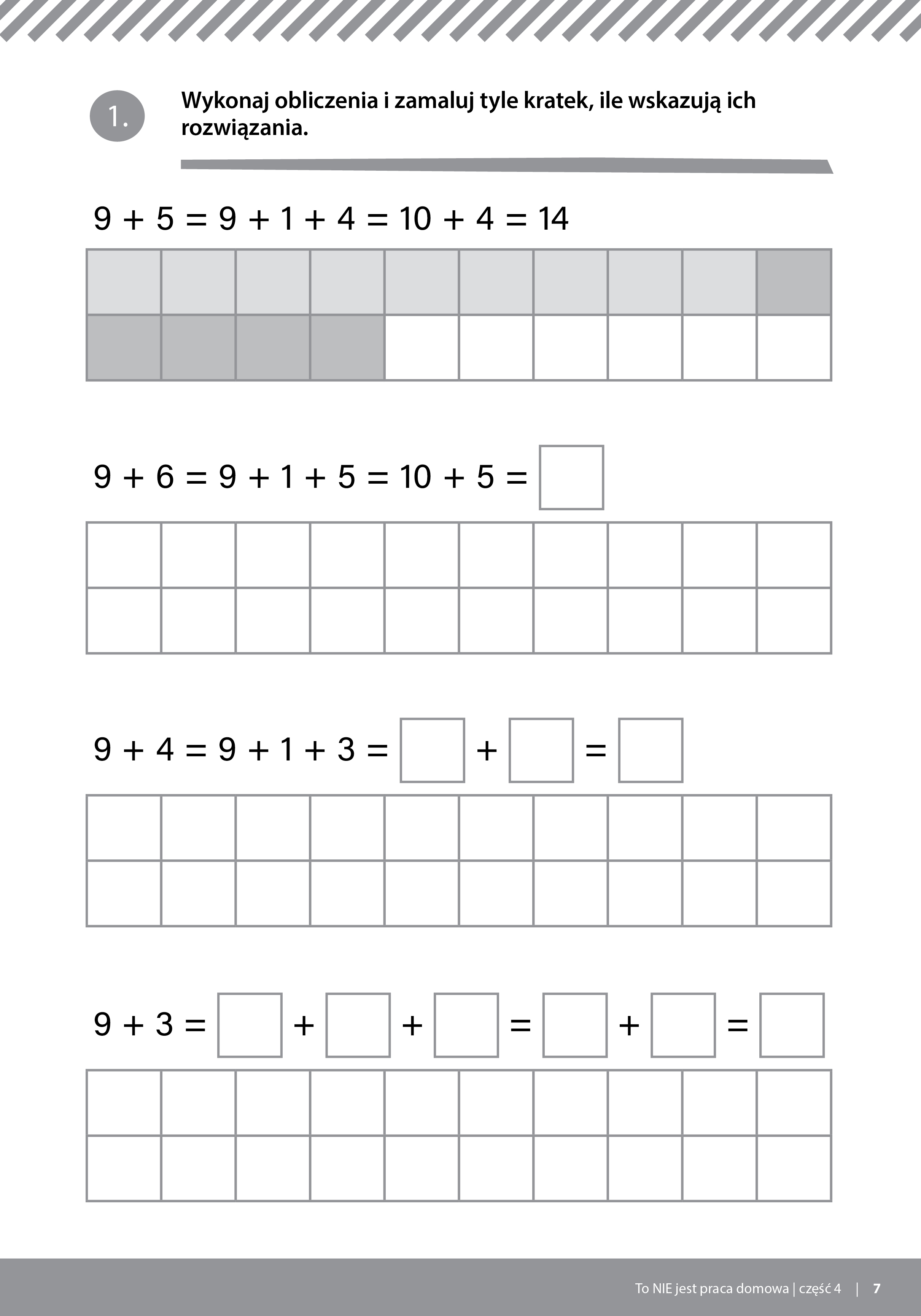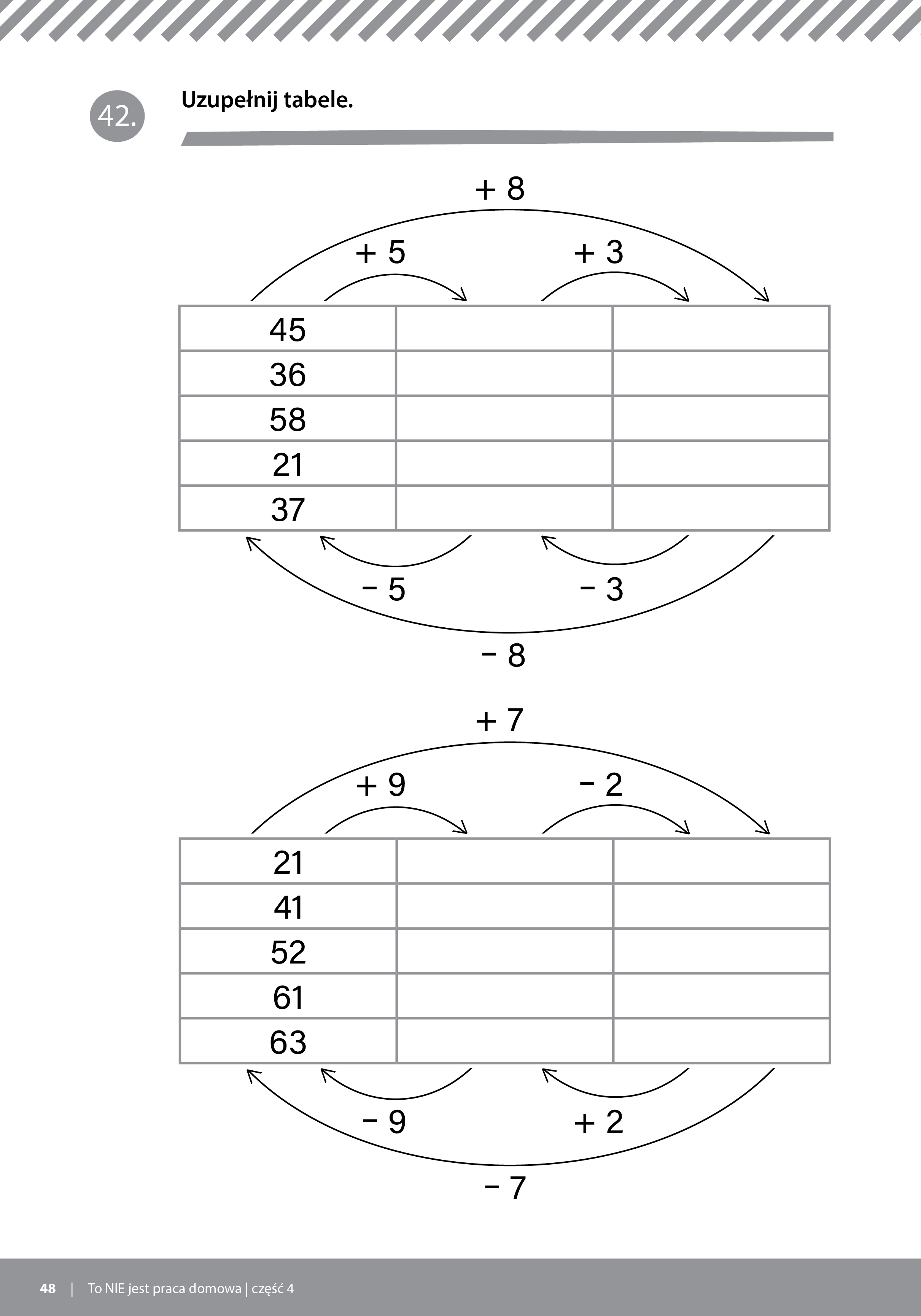 Czwarta książka z serii To NIE jest praca domowa pt. Dodawanie i odejmowanie w zakresie 50 i 100 z przekraczaniem progu. Ćwiczenia doskonalące skierowana jest do dzieci na pierwszym szczeblu kształcenia (klasy 1–3), które chciałyby utrwalić i doskonalić swoje umiejętności dodawania i odejmowania w zakresie 100, oraz do uczniów ze specjalnymi potrzebami edukacyjnymi. Obejmuje ona zadania o zróżnicowanej formie i stopniu trudności, tak aby jak najlepiej przygotować uczniów do samodzielnego wykonywania coraz bardziej zaawansowanych operacji matematycznych w oparciu o posiadaną wiedzę i umiejętności na kolejnych etapach kształcenia. Z powodzeniem może być wykorzystywana w ramach zajęć realizowanych przez koła matematyczne w szkole, a także stanowić inspirację dla wszystkich osób, których zadaniem jest edukacja i wspomaganie rozwoju dzieci: nauczycieli, opiekunów, pedagogów i psychologów z poradni psychologiczno-pedagogicznych, jak również rodziców.