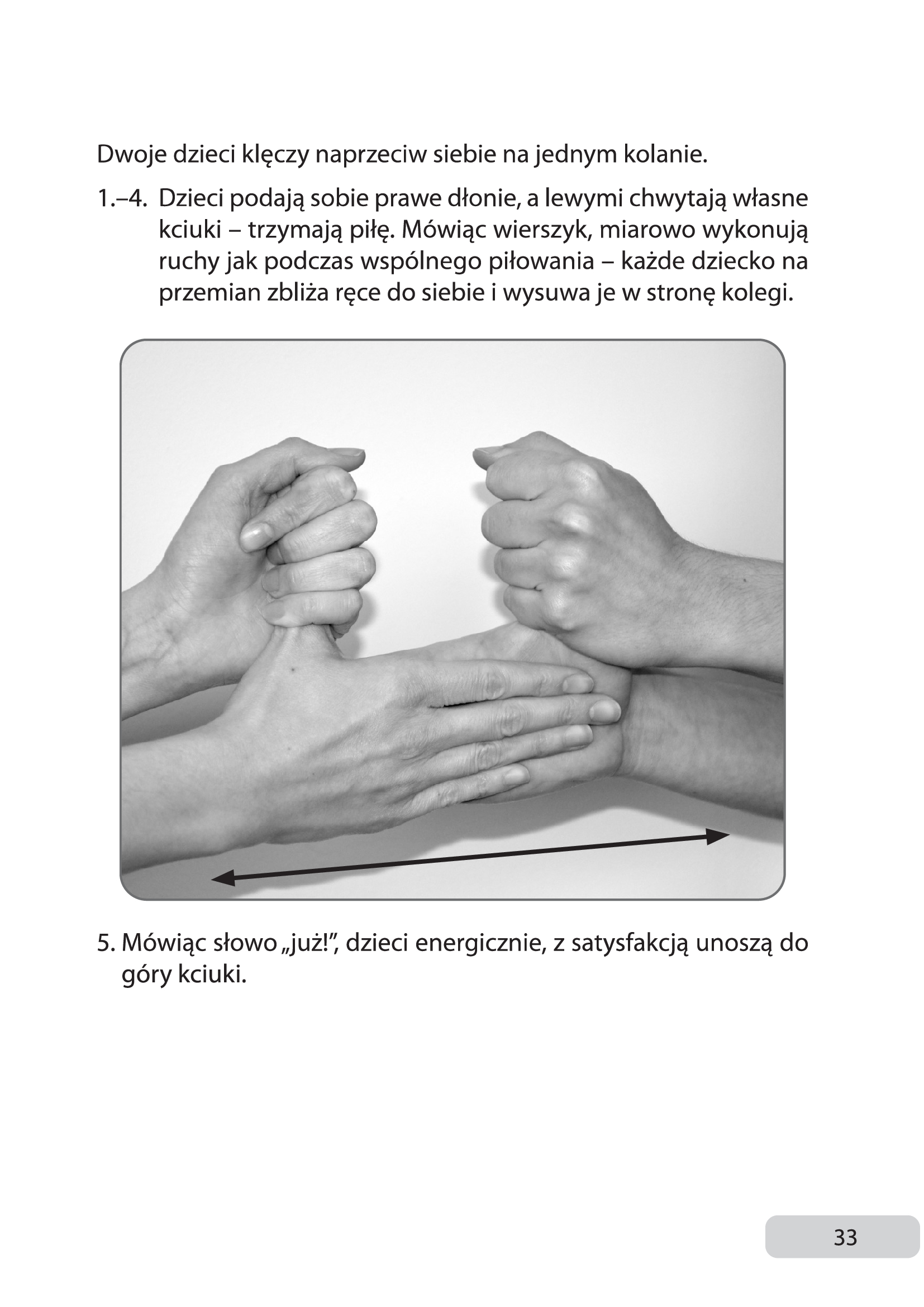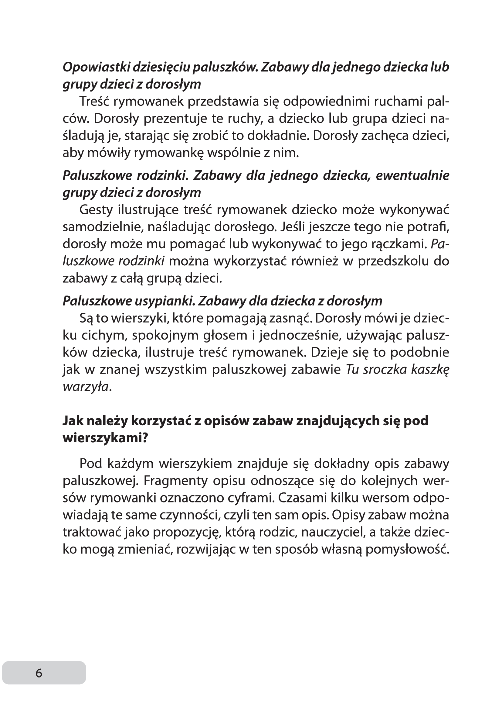 Zaprezentowane w tej książeczce zabawy paluszkowe są nie tylko świetnym sposobem spędzania czasu z rówieśnikami lub rodzicami, ale przede wszystkim pomagają doskonalić motorykę małą, czyli sprawność palców i dłoni. Dziecko zapamiętując rymowankę, dodatkowo rozwija uwagę i pamięć słuchową, poznaje nowe słowa i pojęcie rymów.