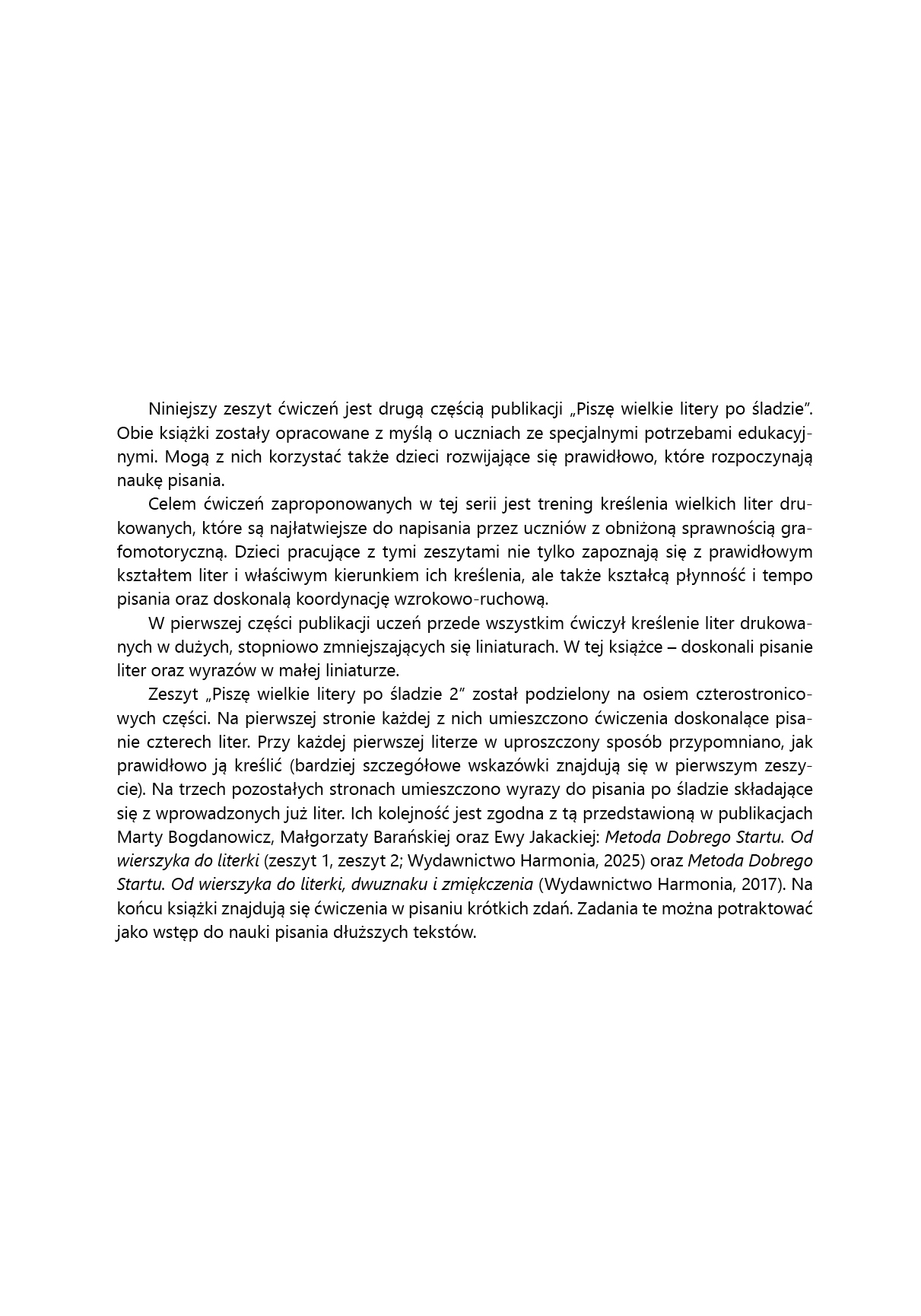 Niniejszy zeszyt jest drugą częścią publikacji „Piszę wielkie litery po śladzie”. Celem ćwiczeń zaproponowanych w tej serii jest trening kreślenia wielkich liter drukowanych, które są najłatwiejsze do napisania przez uczniów z obniżoną sprawnością grafomotoryczną. Dzieci pracujące z tymi zeszytami zapoznają się z prawidłowym kształtem liter i właściwym kierunkiem ich kreślenia, kształcą płynność i tempo pisania oraz doskonalą koordynację wzrokowo-ruchową.