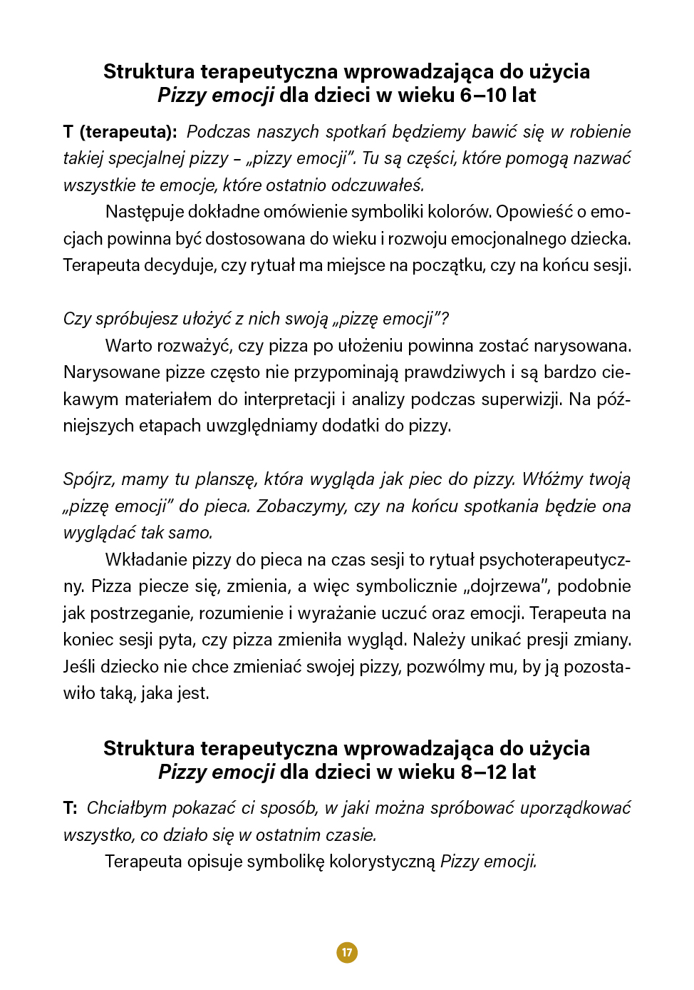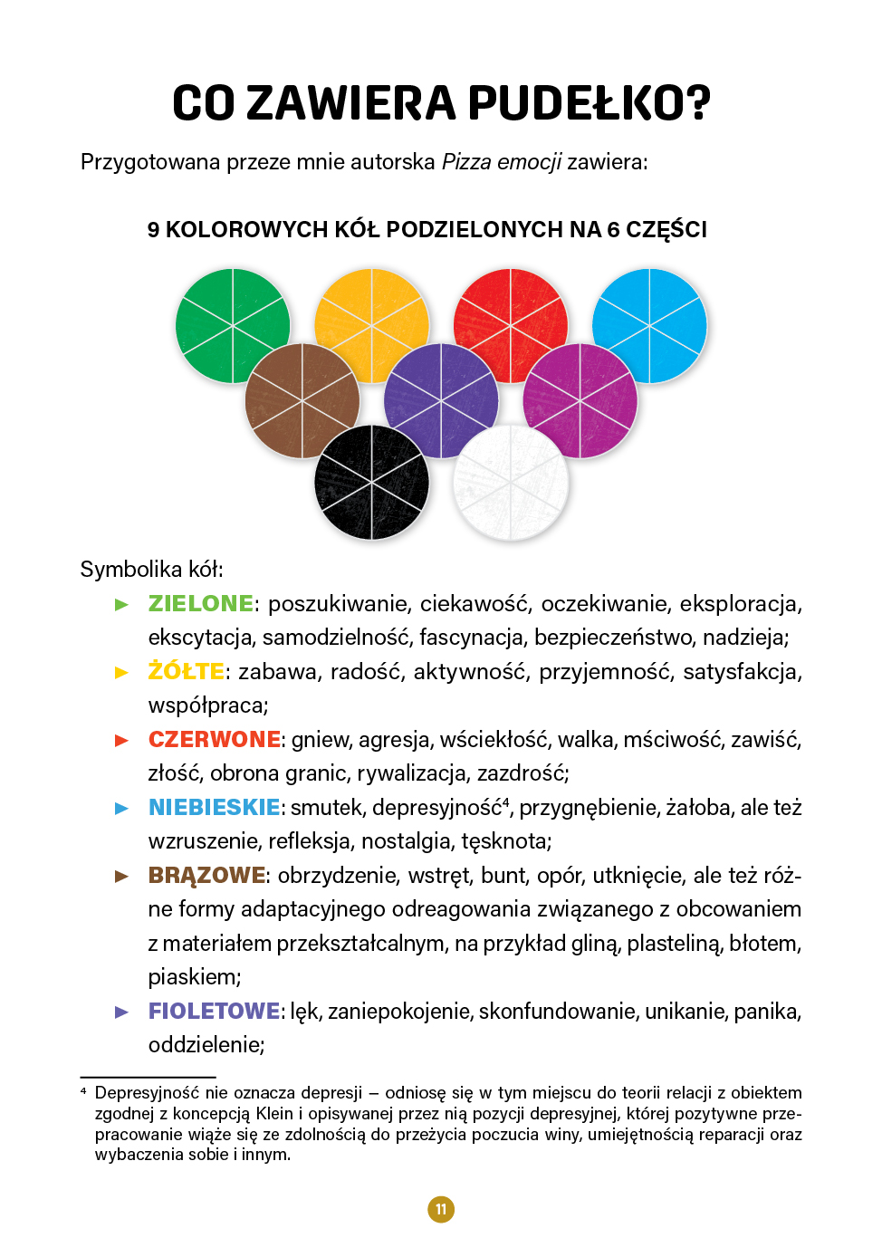 Zeszyt wchodzący w skład zestawu zawiera omówienie teorii, z których czerpie Pizza emocji, opis proponowanych sposobów pracy z publikacją, przykładowe interpretacje poszczególnych kolorów symbolizujących stany emocjonalne, struktury terapeutyczne (dla dzieci w wieku 6–10 oraz 8–12 lat, do zajęć grupowych lub zabaw z rodzicem, do pracy z objawem, do wzbogacania zasobu słowno-pojęciowego dzieci), a także instrukcję do gry planszowej Pizza emocji, stanowiącej wspaniałe narzędzie terapeutyczne, uatrakcyjniające pracę z publikacją.