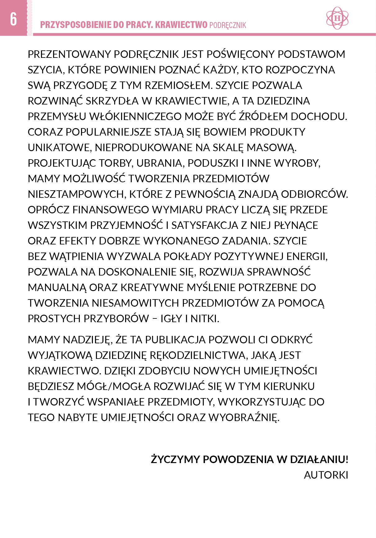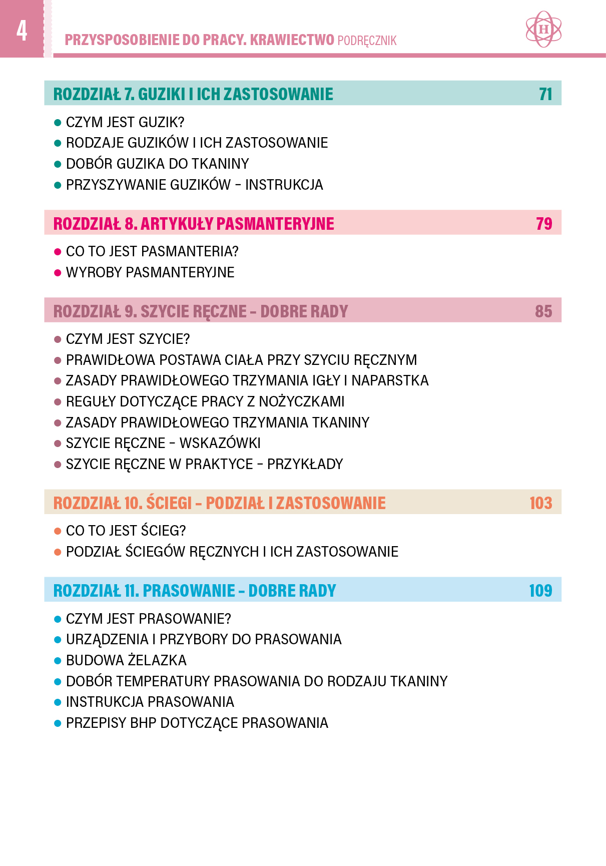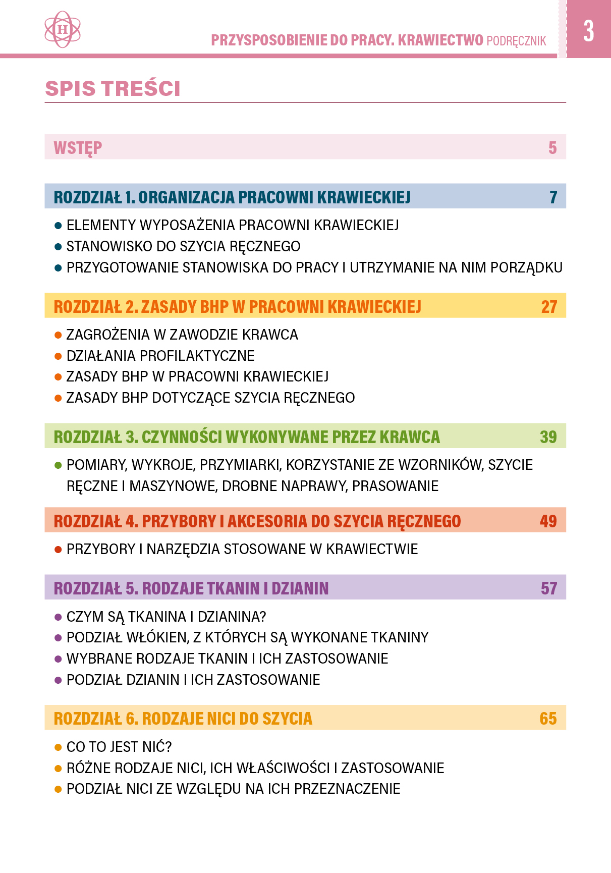 - organizacja pracowni krawieckiej oraz obowiązujące w niej zasady BHP
