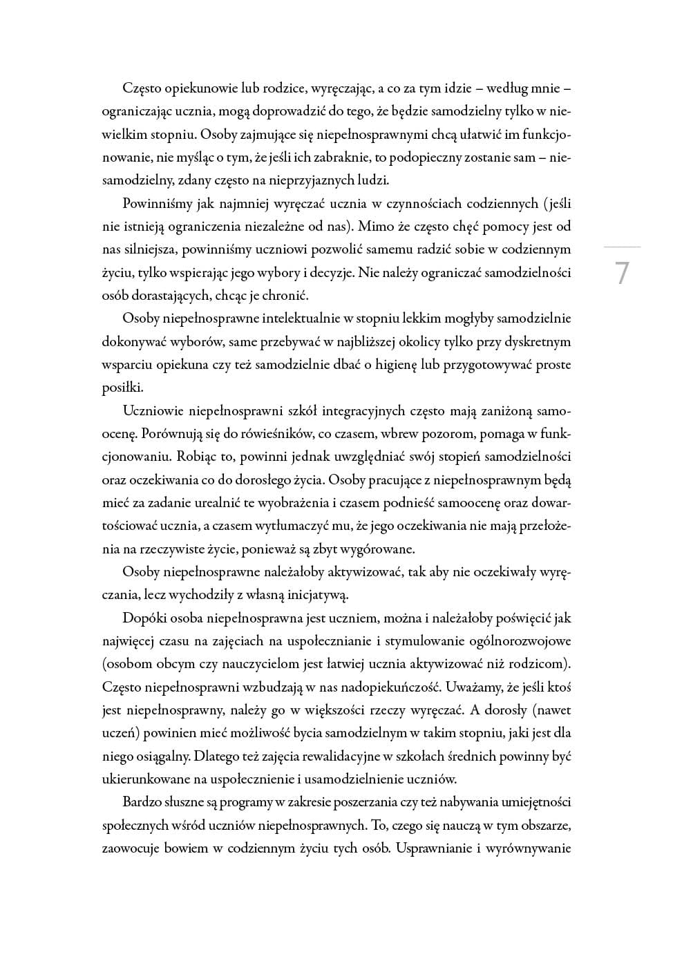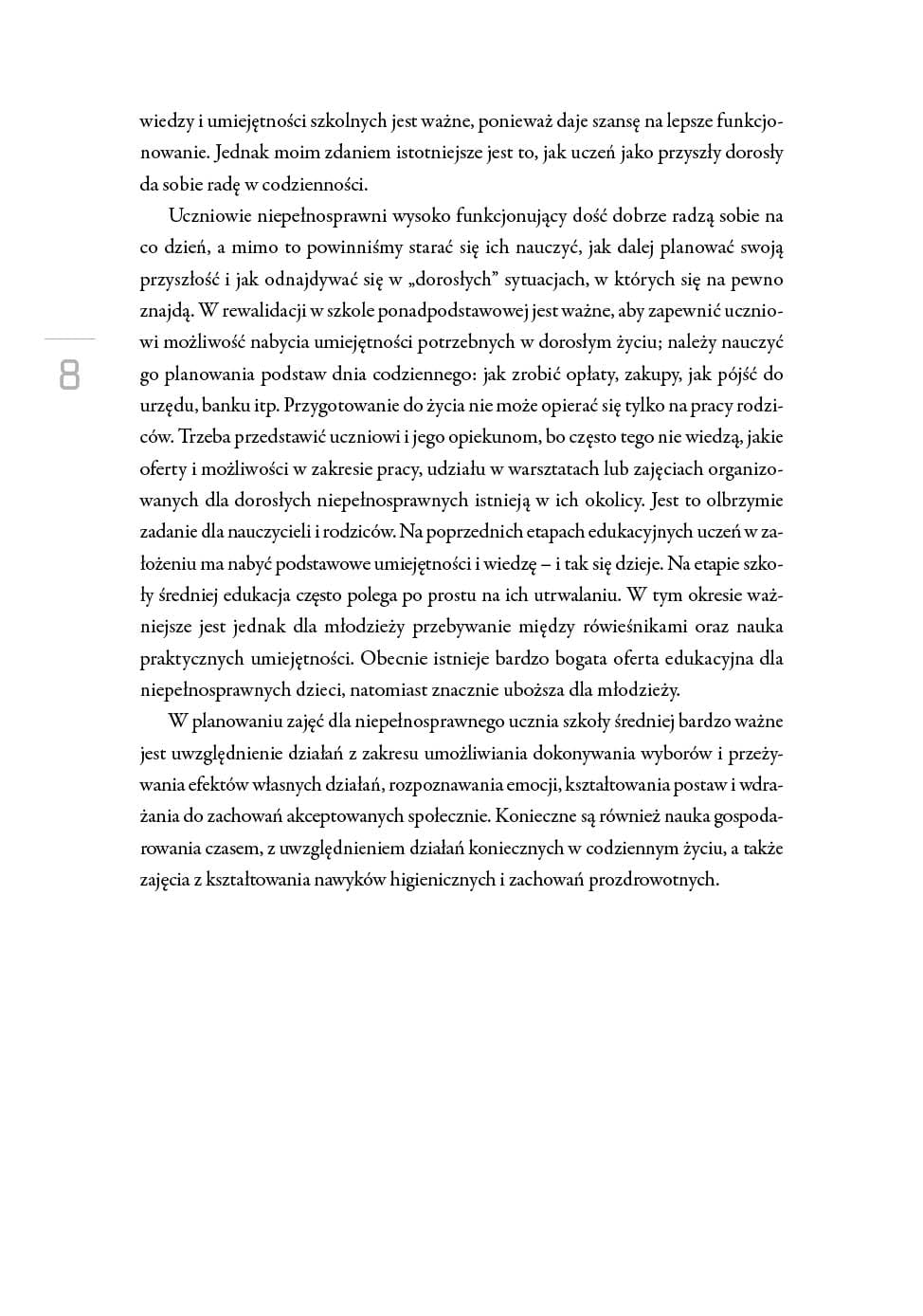 Prezentowana publikacja jest poradnikiem dla nauczycieli szkół średnich pracujących z uczniem z niepełnosprawnością. Zadanie nauczyciela na tym etapie edukacyjnym to pokierowanie rozwojem ucznia, aby w pełni wykorzystując jego naturalne predyspozycje – ciekawość, aktywność, łatwość czerpania wiedzy z otoczenia – wyposażyć go w wiedzę dotyczącą przyszłego funkcjonowania.