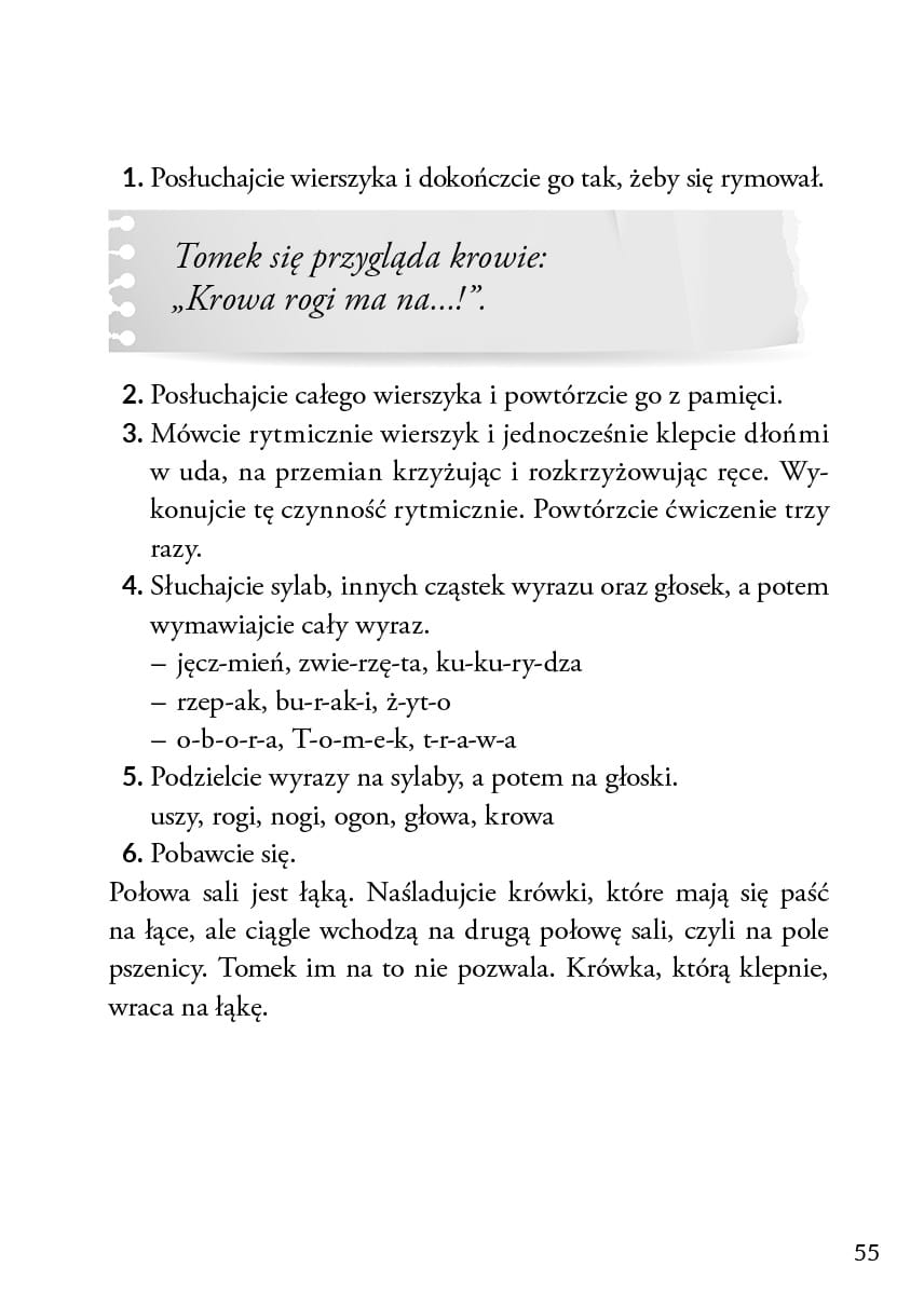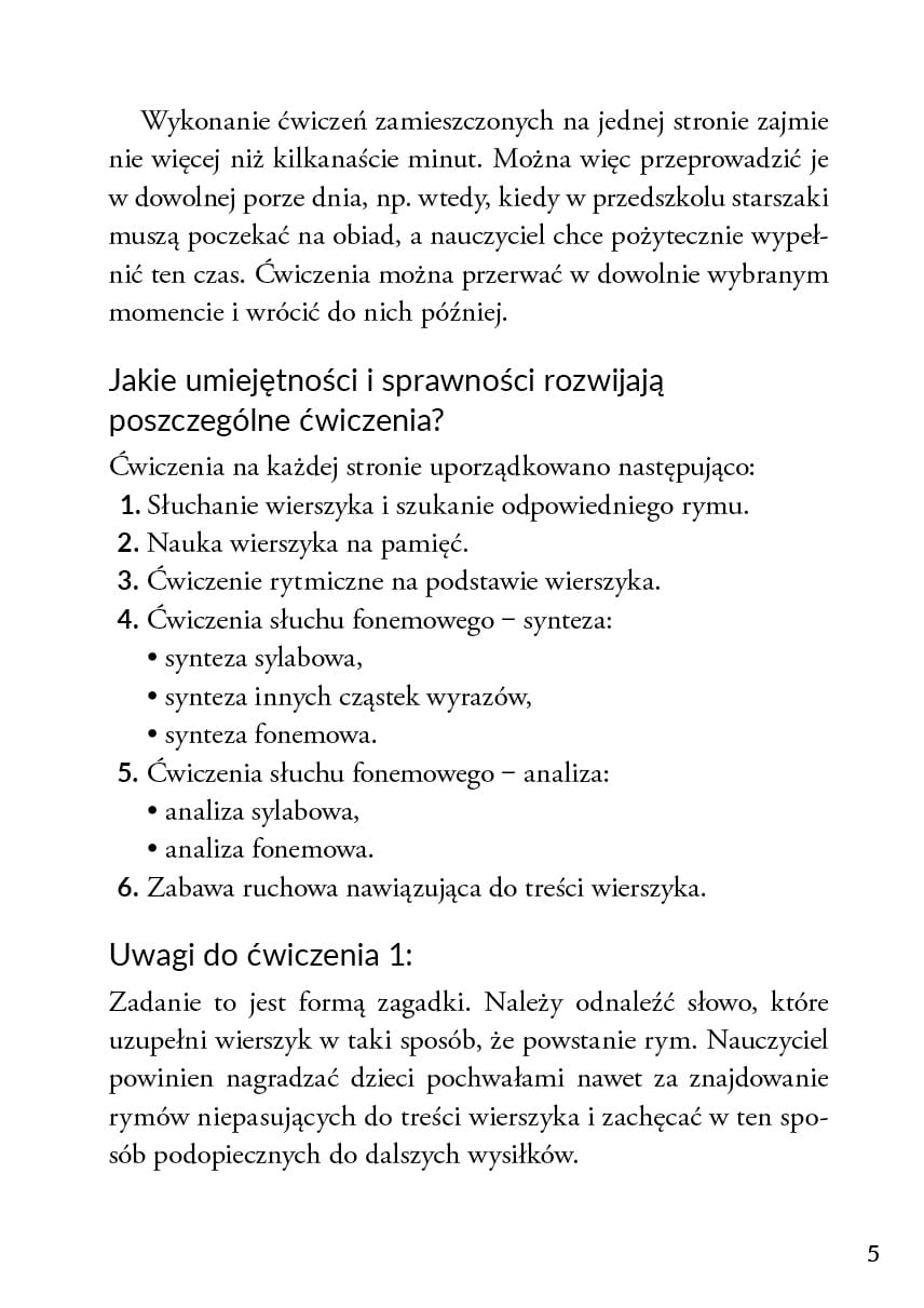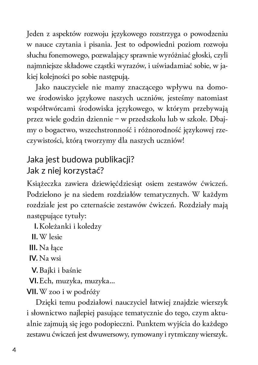 Książeczka Rymuj, głoskuj, w rytmie klaszcz! powstała po to, aby pomóc nauczycielom w rozwijaniu umiejętności językowych przedszkolaków i najmłodszych uczniów. Skorzystają z niej także nauczyciele starszych dzieci, które z różnych powodów potrzebują wsparcia w zakresie rozwoju językowego. Prezentowana publikacja obejmuje dziewięćdziesiąt osiem zestawów ćwiczeń. Każdy zestaw zawiera dwuwersowy wierszyk będący punktem wyjścia do ćwiczeń rytmicznych, ćwiczeń słuchu fonemowego i zabawy ruchowej.