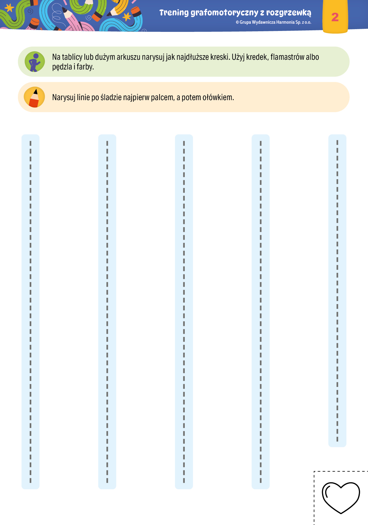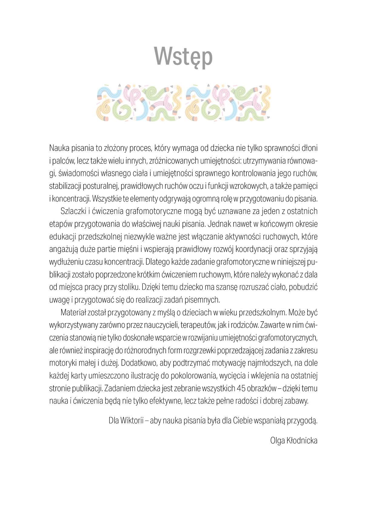 Publikacja została opracowana z myślą o dzieciach w wieku przedszkolnym. Sprawdzi się w pracy nauczycieli, terapeutów i rodziców, stanowiąc wartościowe narzędzie w przygotowaniu najmłodszych do nauki pisania. Zawarte w niej zadania łączą pracę przy stoliku z krótkimi aktywnościami ruchowymi, które poprzedzają każde ćwiczenie. Taka forma sprzyja rozwojowi motoryki małej i dużej oraz pomaga wydłużać czas koncentracji.