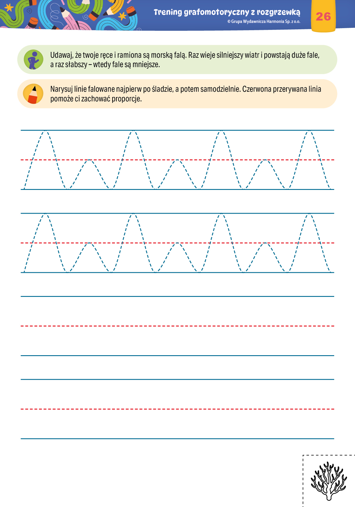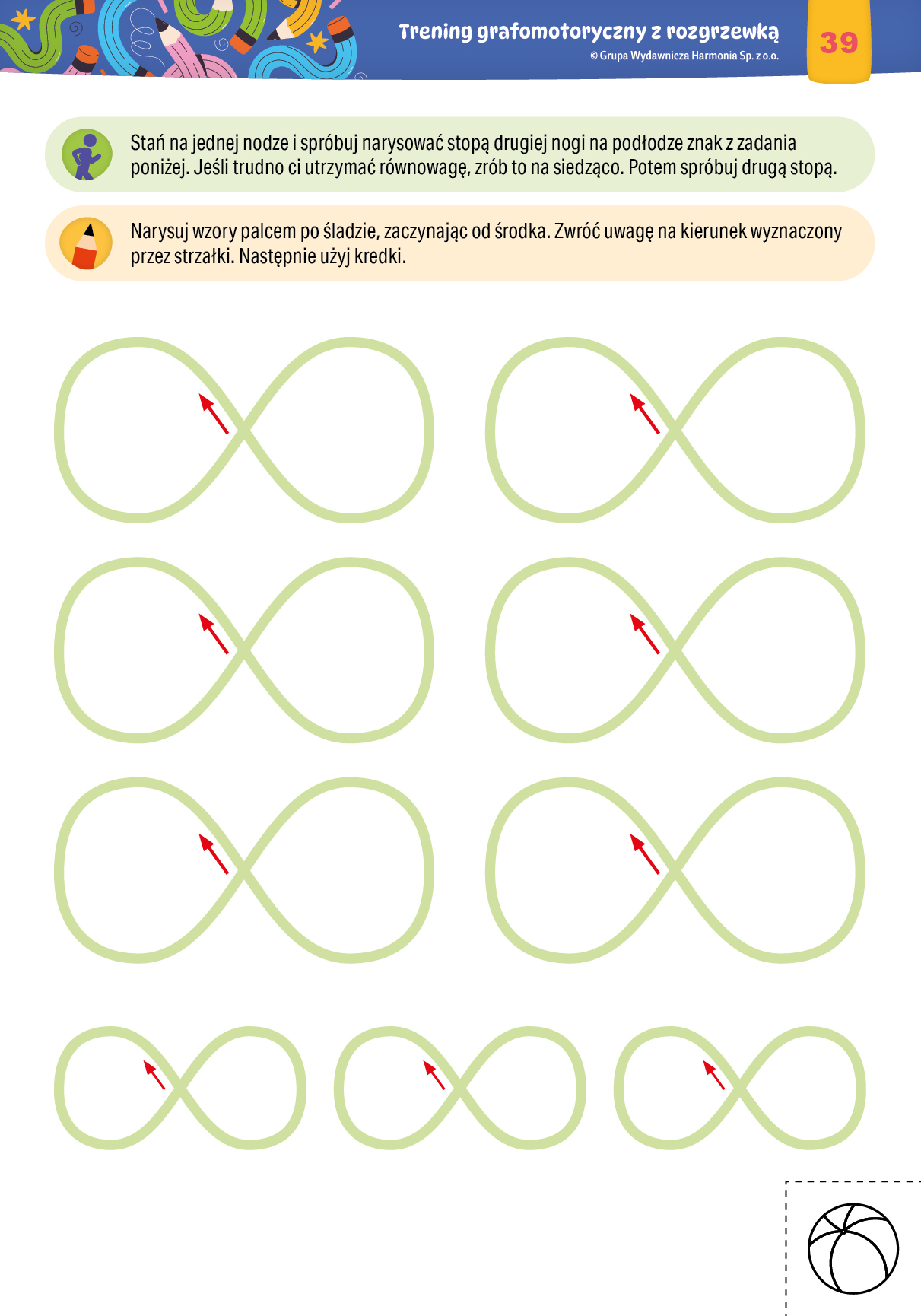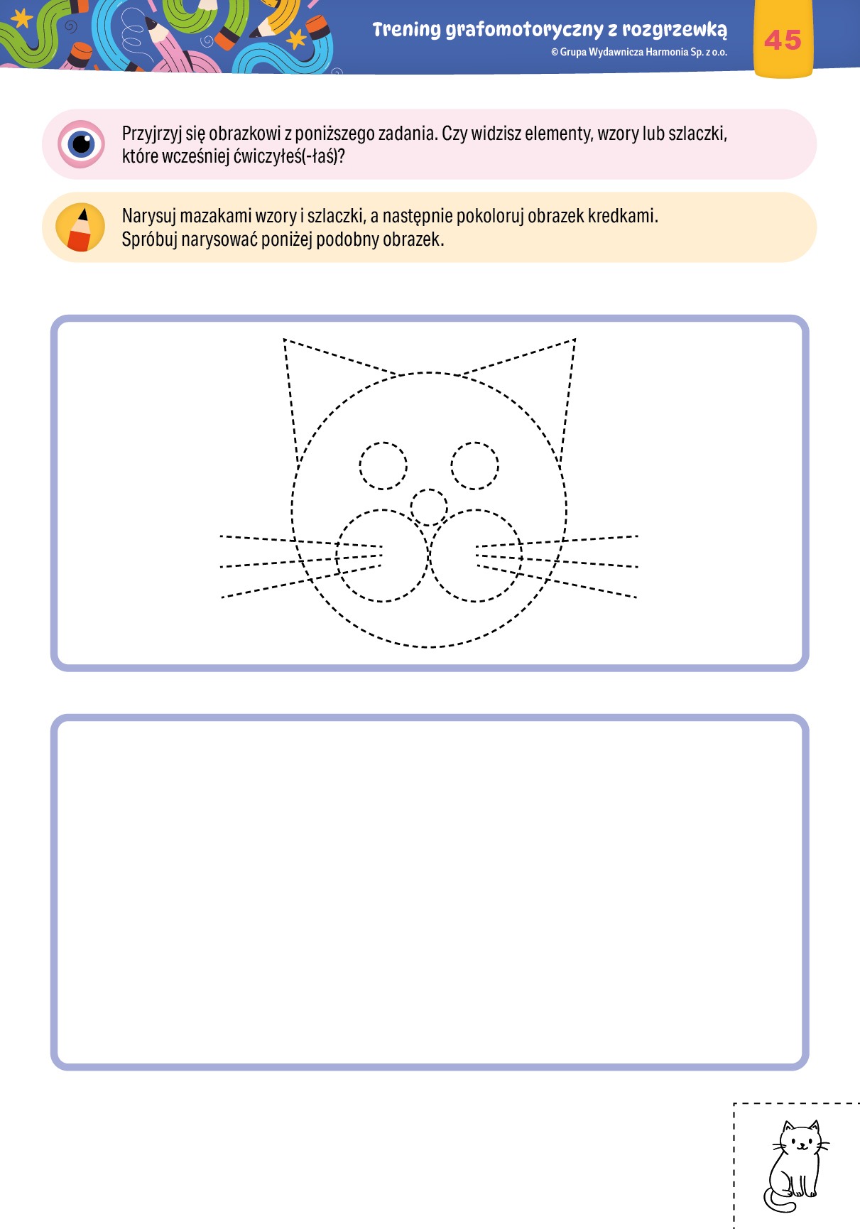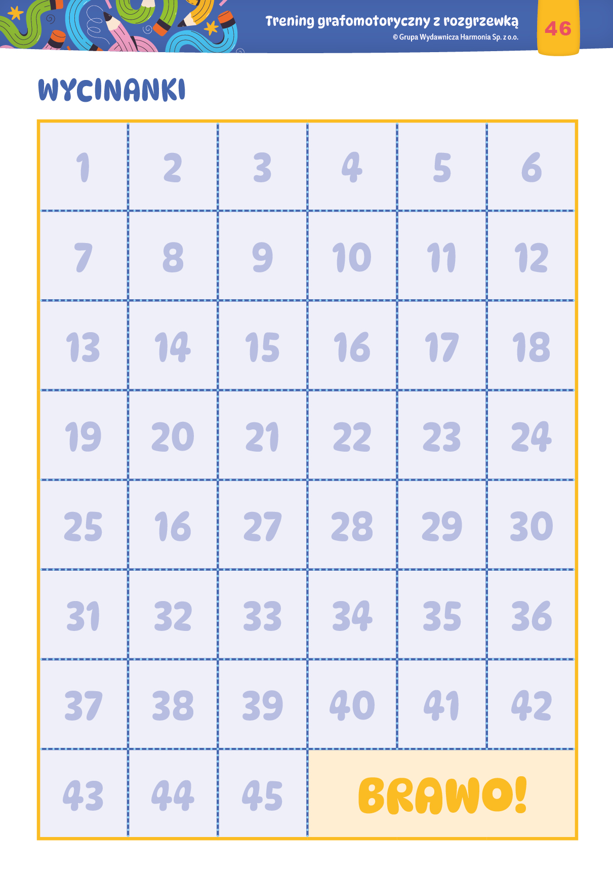 Dodatkową motywacją są ilustracje do kolorowania i wycinania – dziecko może zebrać komplet 45 obrazków, dzięki czemu ćwiczenia zmieniają się w atrakcyjną formę zabawy.