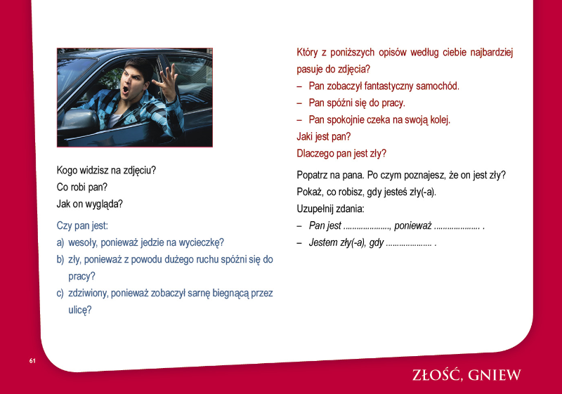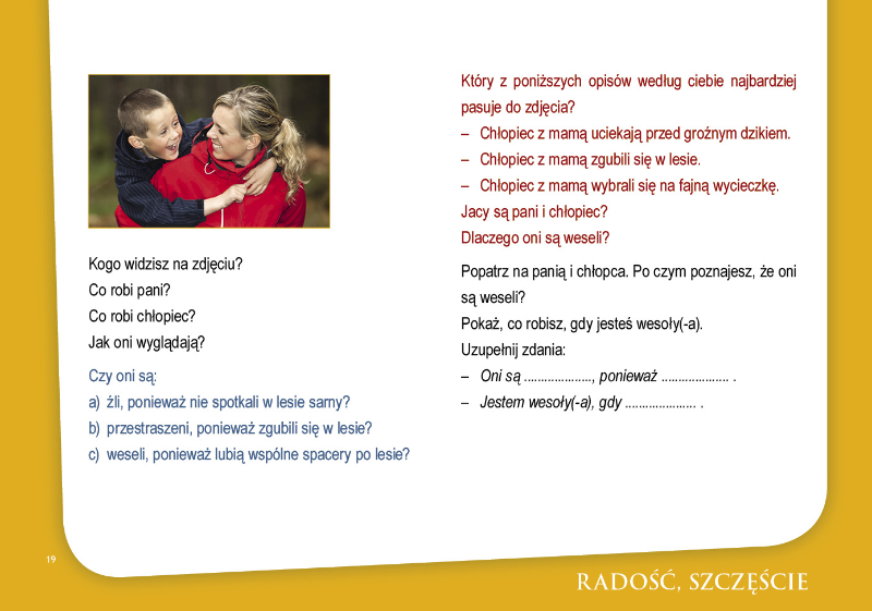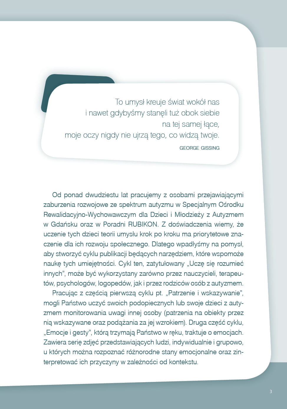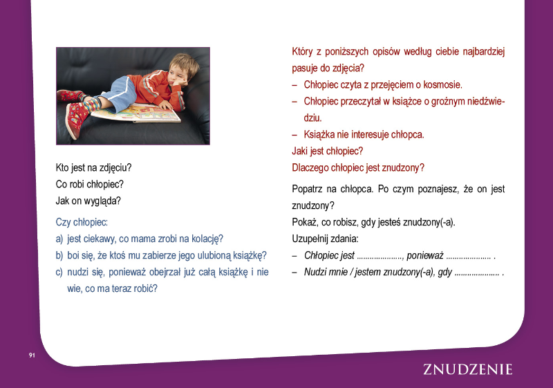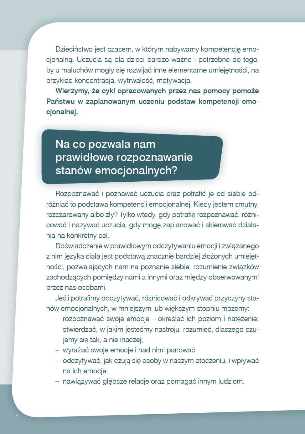 Pytania i polecenia są pomocą w nauce rozpoznawania, nazywania oraz wskazywania przyczyn pojawienia się różnorodnych stanów emocjonalnych w zależności od kontekstu sytuacyjnego. Książka powstała z myślą o kształtowaniu umiejętności ważnych dla rozwoju społecznego zarówno małych dzieci, jak i osób z zaburzeniami, na przykład ze spektrum autyzmu.