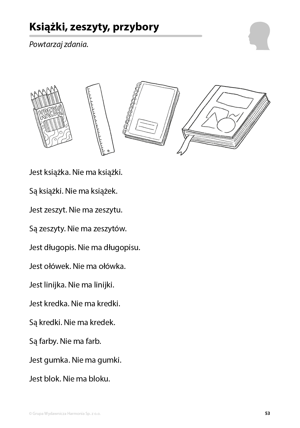 Publikacja jest przeznaczona dla uczniów w wieku wczesnoszkolnym. Część zawartych w niej zadań językowych została opatrzona materiałem obrazkowym, tak aby ilustracje stanowiły podstawę wykonywanych ćwiczeń. Dzięki temu możemy prowadzić skuteczniejszą terapię mowy.