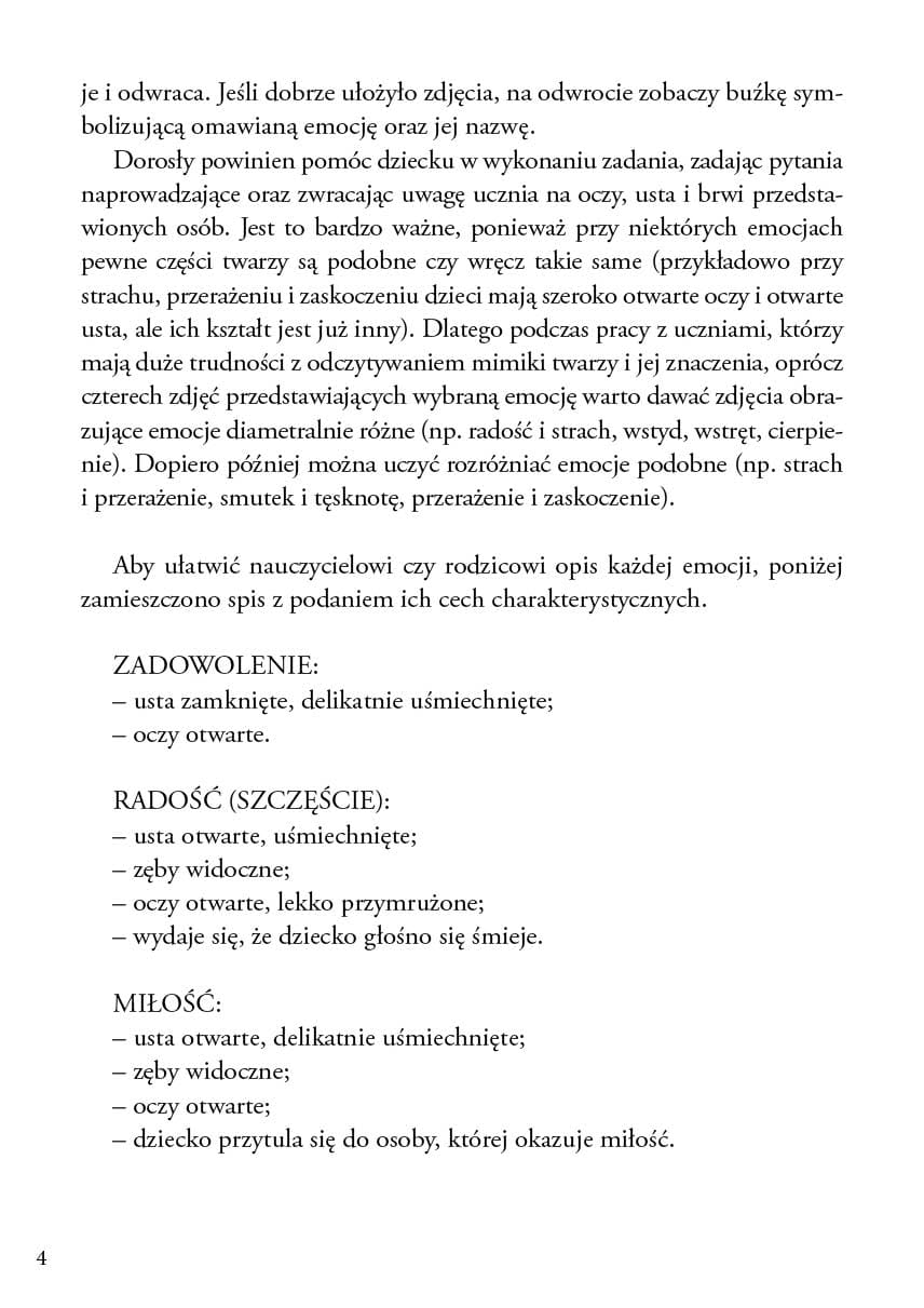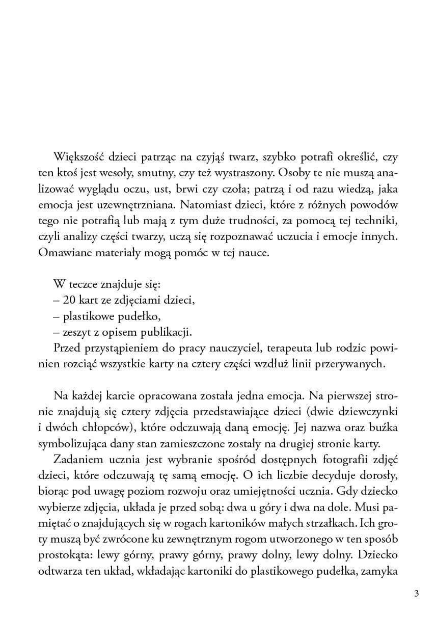 Prezentowana publikacja powstała z myślą o dzieciach, które mają trudności z rozpoznawaniem uczuć i emocji innych ludzi. Pomaga w uczeniu się tej umiejętności poprzez analizę wyglądu twarzy, szczególnie oczu, ust i brwi. W skład zestawu wchodzi 20 kart ze zdjęciami dzieci do wycięcia (łącznie 80 kartoników), plastikowe pudełko oraz zeszyt zawierający opis każdej emocji przedstawionej na kartach. Zadaniem ucznia jest wybranie spośród dostępnych fotografii zdjęć dzieci, które odczuwają tę samą emocję, oraz ułożenie ich w odpowiedniej kolejności w dołączonym pudełku. Jeśli dziecko dobrze ułoży zdjęcia, na odwrocie zobaczy buźkę symbolizującą omawianą emocję oraz jej nazwę.
