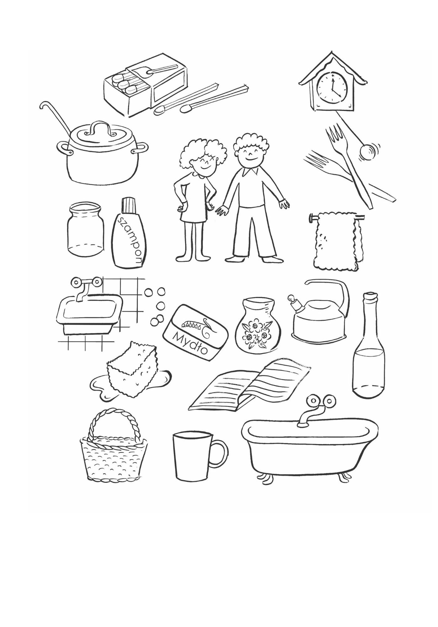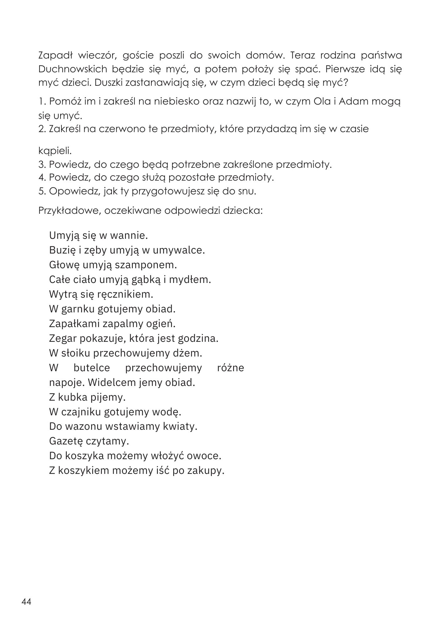 Ilustracje, które są podstawą ćwiczeń, dotyczą tematów bliskich dziecku – rodziny, przyrody, otoczenia, codziennych czynności. Ich bohaterami są dwie rodziny – Duchnowskich i Duszków. Rysunki są czarno-białe, by dziecko po skończonych ćwiczeniach mogło je pokolorować.