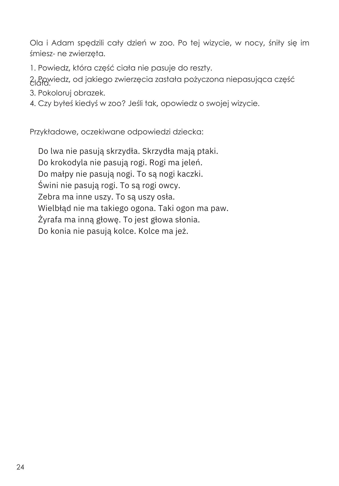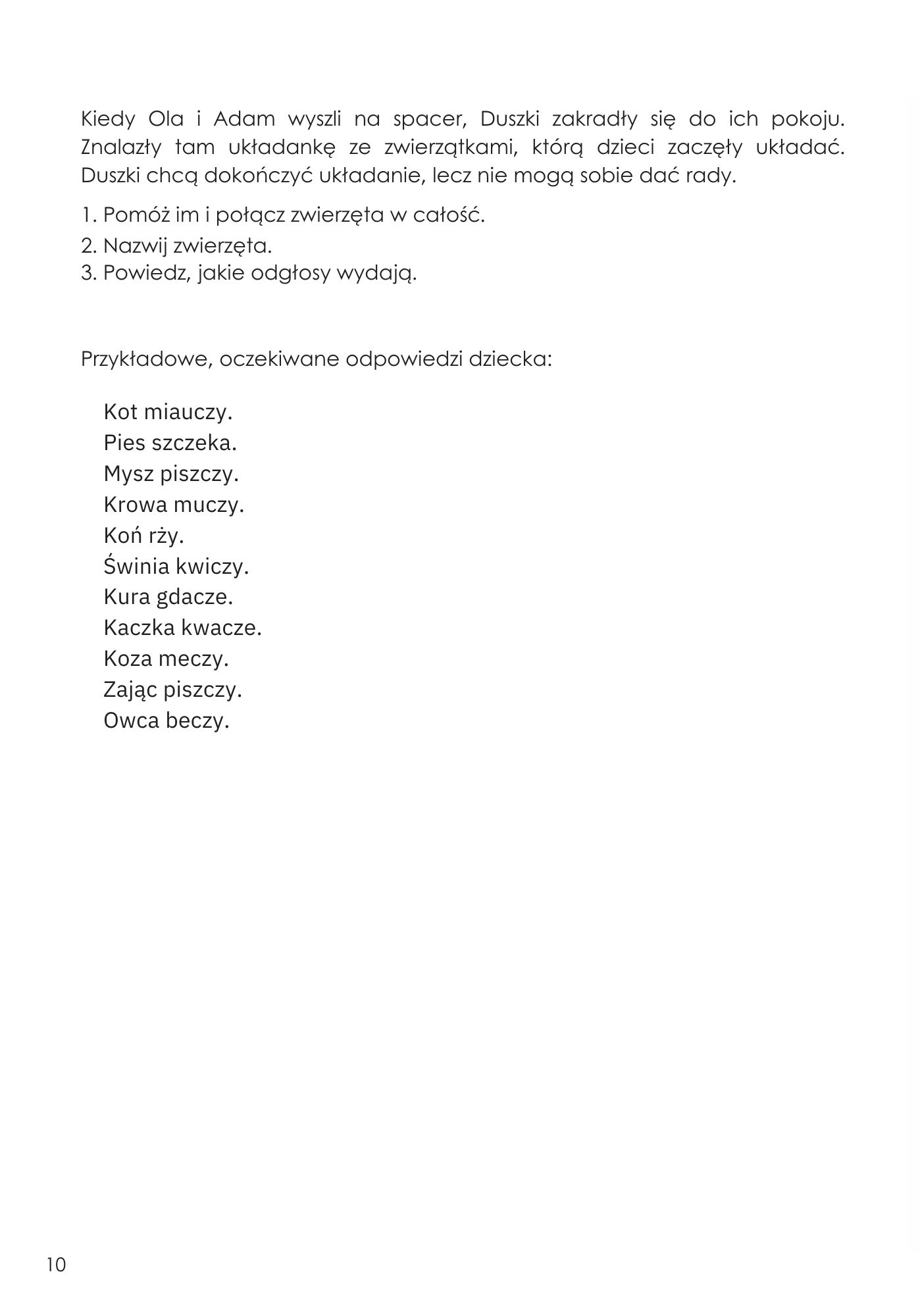 Pozycja ta jest kierowana do logopedów, nauczycieli i rodziców dzieci, które mają problemy z mówieniem. Metoda zastosowana przez autorkę opiera się na ilustracjach i wiążących się z nimi pytaniach, poleceniach. Całość jest tak ułożona, by dziecko najpierw wypowiadało pojedyncze słowa, potem zdania, na końcu opowiedziało o tym, co dzieje się na obrazku. Również pytania zostały zróżnicowane pod względem trudności.